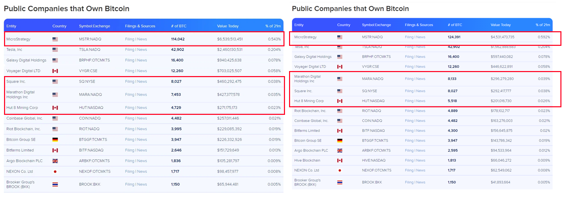 Theo quan sát trên trang buybitcoinworldwide, tỷ lệ nắm giữ Bitcoin của các doanh nghiệp, quốc gia vẫn tăng. Dưới đây là so sánh số lượng BTC mà các công ty đại chúng sau hai tháng.