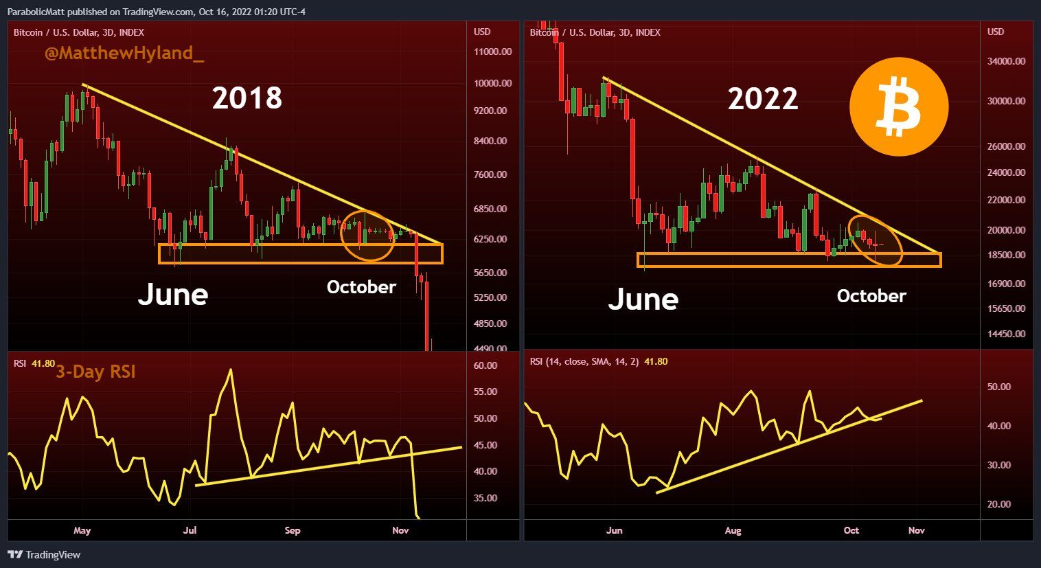 Không chỉ tương đồng về mốc thời gian, mà còn tương đồng về biên độ giá và các tín hiệu chỉ báo kỹ thuật. Quan sát của @MatthewHyland_ chỉ ra những điều đáng chú ý sau.