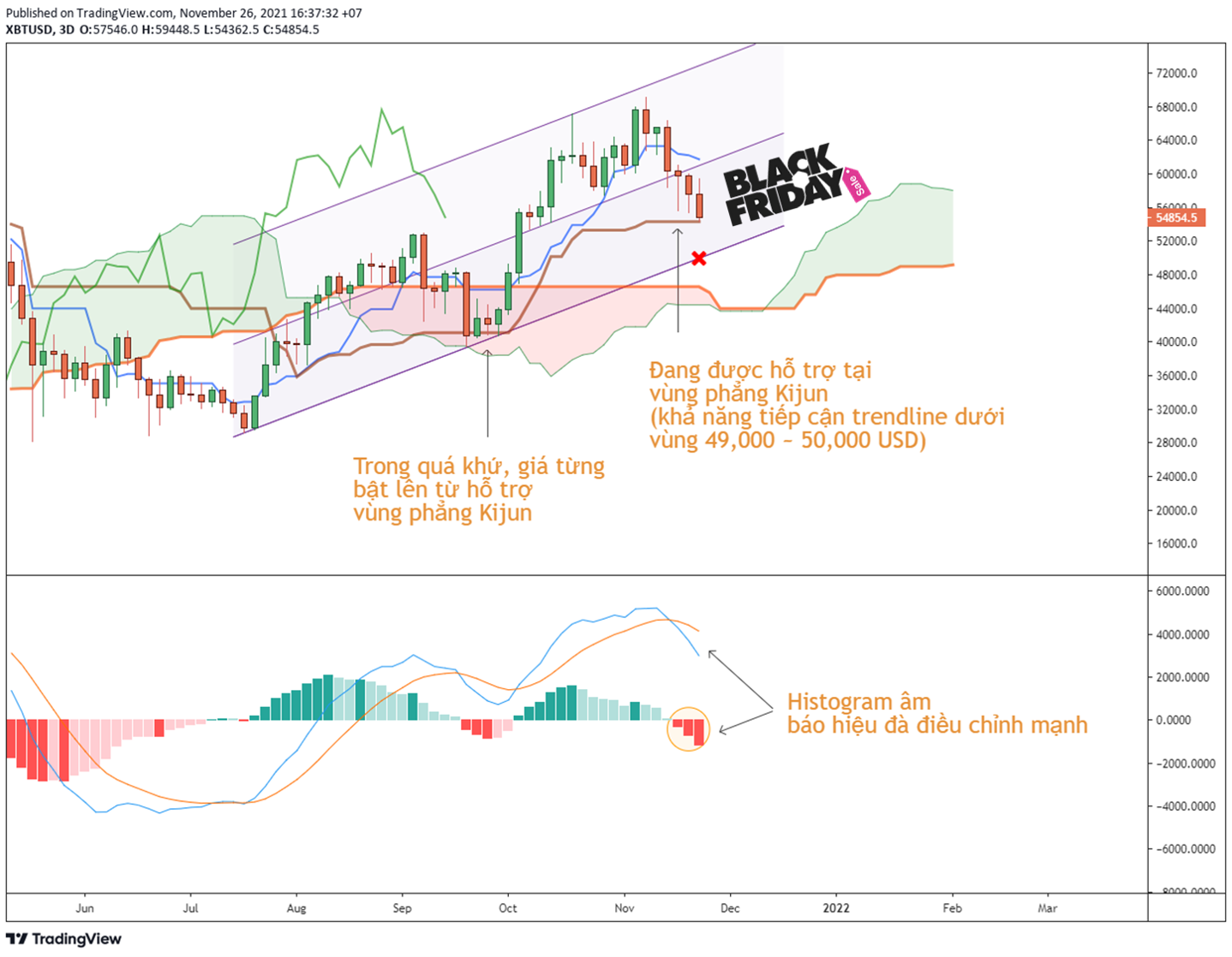 - Trong bài phân tích trước, chúng ta đã đề cập đến khả năng điều chỉnh này. Nếu quan sát trong quá khứ hồi tháng 10, Bitcoin cũng điều chỉnh về vùng phẳng Kijun và test lại đó hơn hai lần trước khi bật tăng. Thế nên, chúng ta cũng có thể dự đoán nếu Bitcoin phục hồi tại vùng 55,000 USD thì nó cũng có thể test lại vùng này vài lần rồi tăng tiếp.