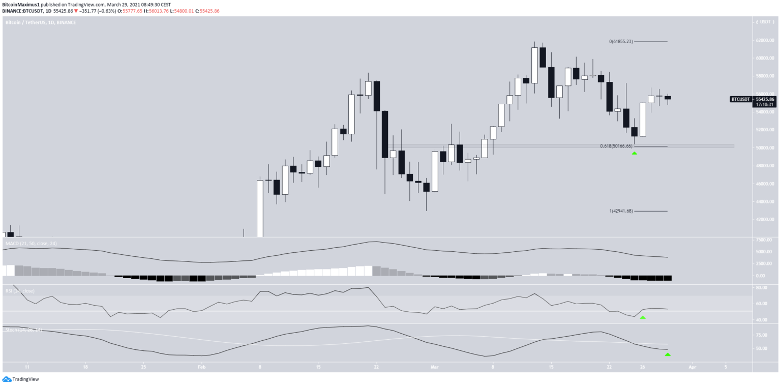 Động thái giảm giá đã kết thúc với một trục vào ngày 25 tháng 3. Điều này xảy ra ngay tại mức thoái lui Fib 0,618 là $ 50,250. Ngày hôm sau, BTC đã tạo ra một thanh nến nhấn chìm tăng giá.