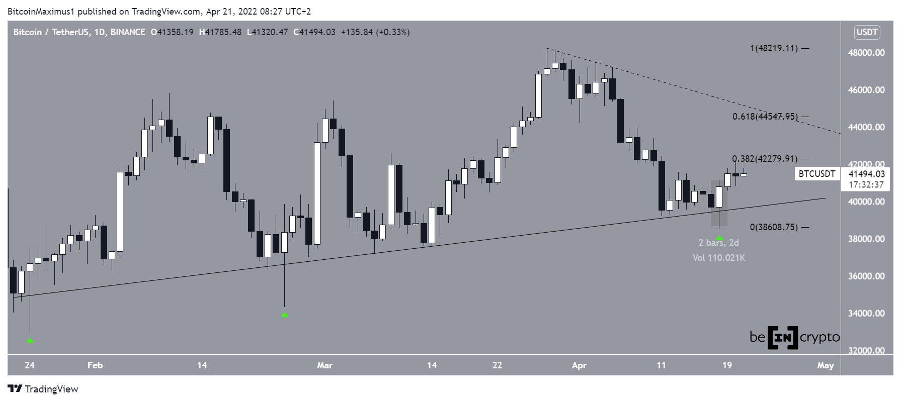 Theo đó, Bitcoin đã tăng trên đường hỗ trợ tăng dần kể từ ngày 24 tháng 1. Đường này đã được xác thực nhiều lần, gần đây nhất là vào ngày 18 tháng 4 (được đánh dấu), khi giá tạo ra một cây nến nhấn chìm tăng giá.