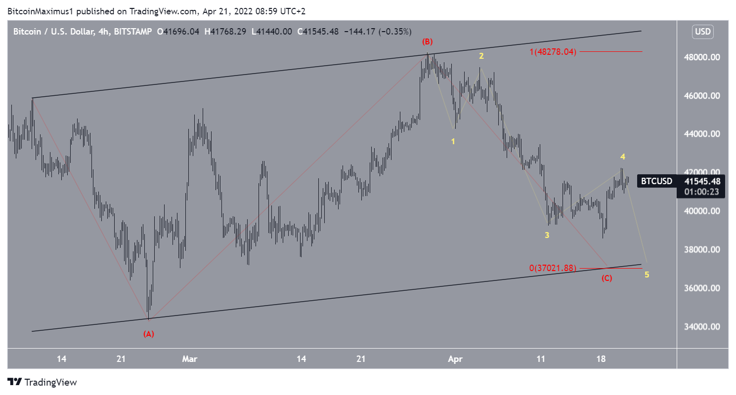 Kịch bản đầu tiên gợi ý rằng BTC vừa hoàn thành làn sóng phụ bốn (màu vàng) và hiện sẽ giảm xuống còn 37,000 USD. Điều này sẽ cung cấp cho các sóng dài hạn A và C tỉ lệ chính xác 1: 1 và xác nhận đường hỗ trợ của một kênh song song tăng dần.