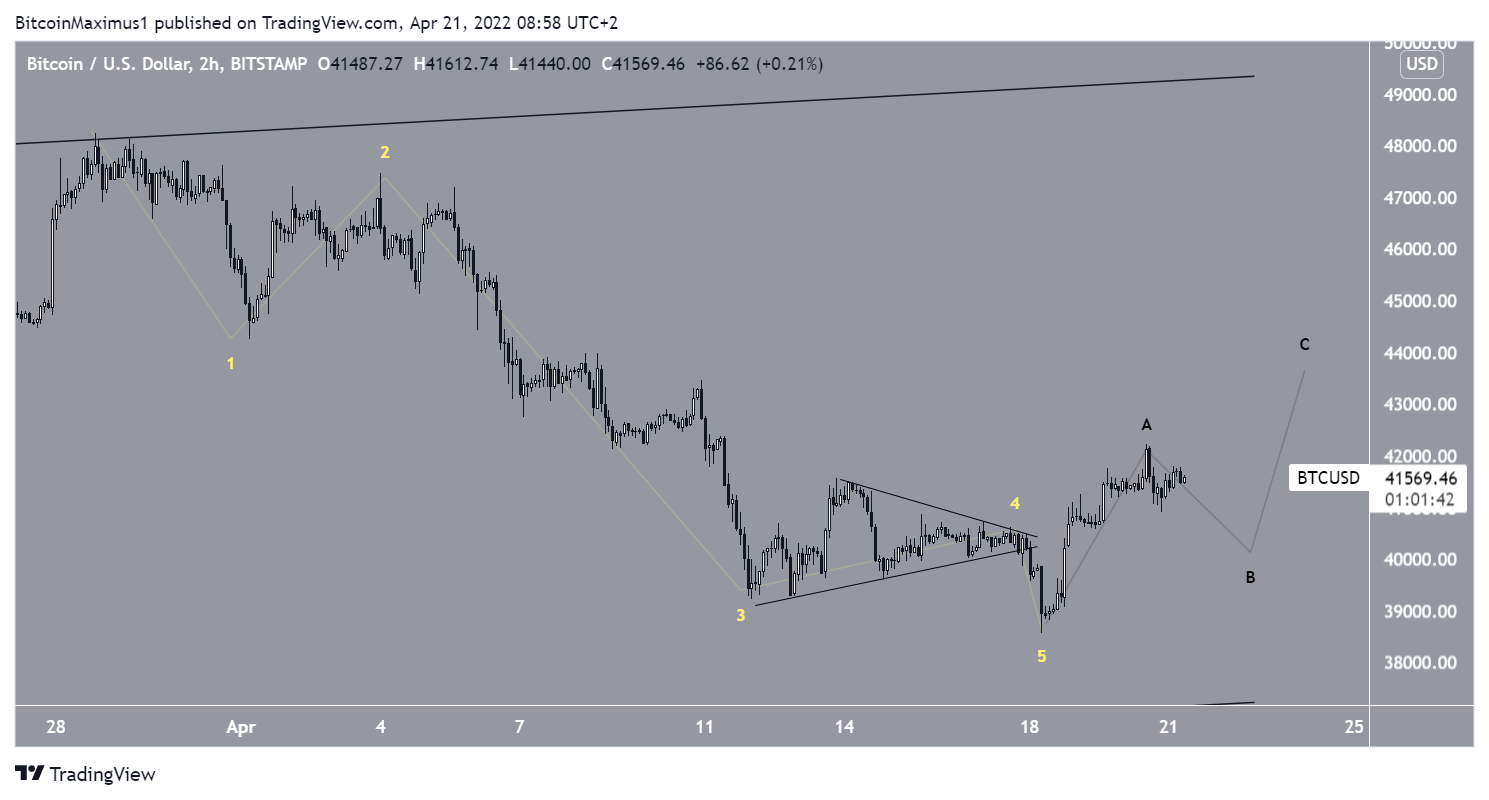 Kịch bản thứ hai cho thấy BTC đã hoàn thành đợt điều chỉnh giảm năm sóng (màu vàng) và hiện đã bắt đầu cấu trúc điều chỉnh A-B-C theo chiều tăng. Sau một đợt giảm ngắn hạn khác, BTC có thể tiếp tục xu hướng tăng lên tới 44,000 USD.