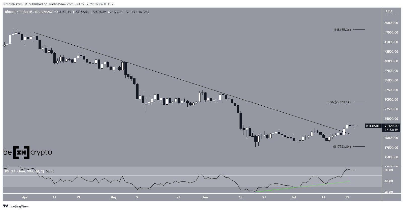 Giá đã tăng lên kể từ đó và bứt phá khỏi đường kháng cự giảm dần vào ngày 18 tháng 7. Mặc dù vẫn chưa bắt đầu một động thái tăng đáng kể, nhưng Bitcoin vẫn đang lơ lửng trên đường kháng cự này.