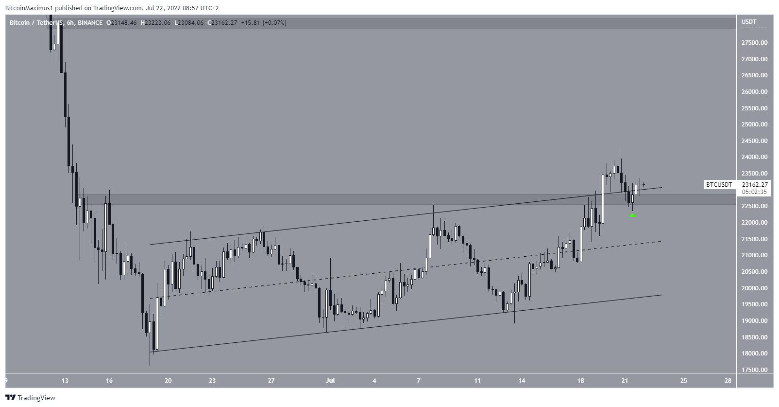 Lý do chính cho điều này là BTC đã thoát ra khỏi một kênh song song tăng dần và hiện đang trong quá trình xác nhận nó dưới dạng hỗ trợ (biểu tượng màu xanh lá cây). Ngoài ra, nó đang trong quá trình xác nhận khu vực ngang 22,600 USD làm hỗ trợ.
