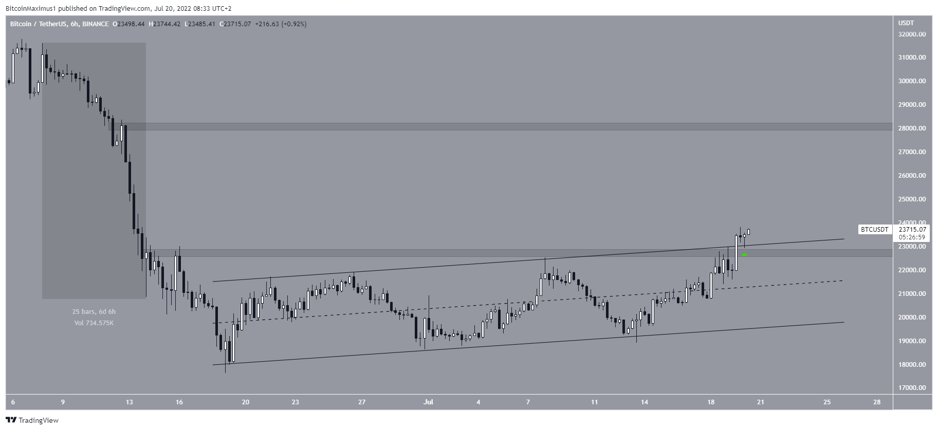 Biểu đồ sáu giờ cũng có chung các dấu hiệu với khung thời gian hàng ngày. Nó cho thấy BTC đã thoát ra khỏi một kênh song song tăng dần và xác nhận nó là hỗ trợ sau đó (biểu tượng màu xanh lá cây). Trong đợt đột phá này, BTC cũng đã di chuyển trên vùng kháng cự ngang 22,800 USD.
