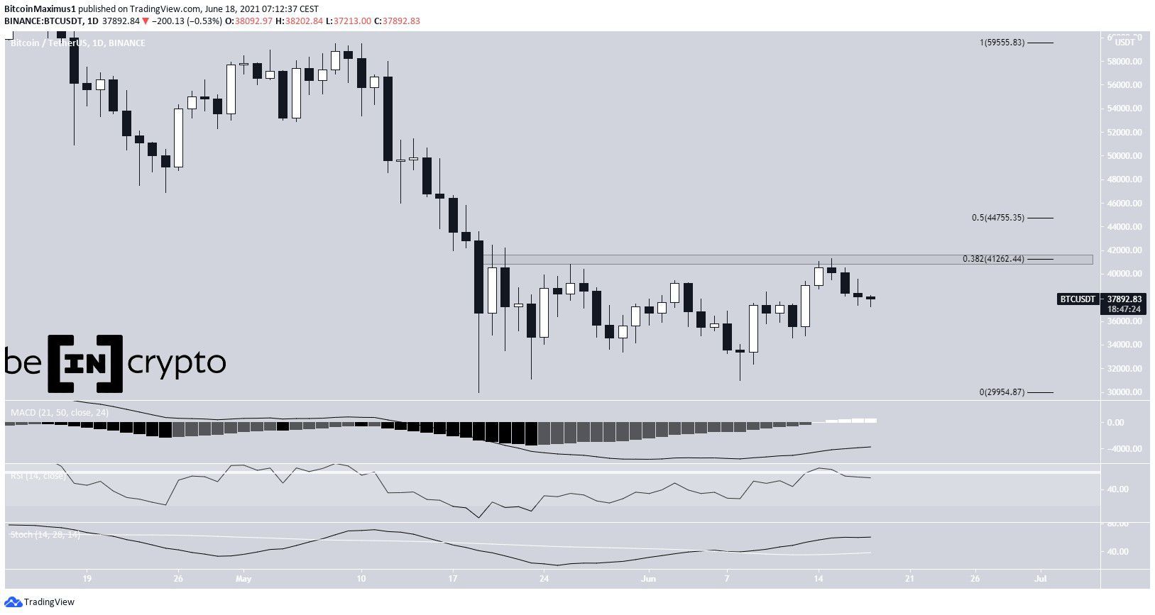 Bitcoin đã đạt mức cao $41,330 vào ngày 15 tháng 6 nhưng đã giảm kể từ đó. Mức cao này được tạo ra bên trong một vùng kháng cự quan trọng, tạo thành từ vùng kháng cự nằm ngang $41,250 và mức kháng cự thoái lui 0.382 Fib. Tại thời điểm đóng nến ngày, Bitcoin đã không thể vượt lên trên mức này. Phải biết rằng lần cuối cùng giá BTC nằm trên vùng $41,000 là vào ngày 19 tháng 5.