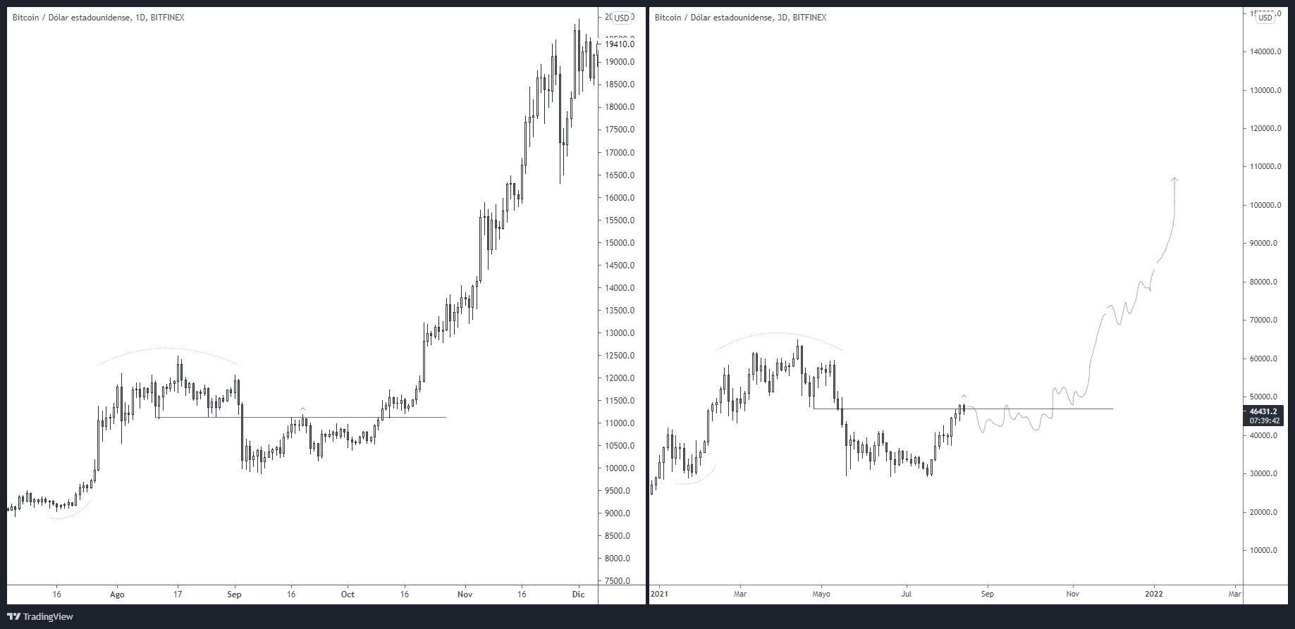 Nhà giao dịch tiền điện tử @Inmortalcrypto đã đăng 2 biểu đồ trên Twitter vào ngày hôm qua để so sánh hành động giá hiện tại với hồi tháng 8 đến tháng 9 năm 2020. Đây là khoảng thời gian giá BTC đạt đỉnh ở mức $12,500. Và sau đó giảm xuống đáy ở mức $9,800. Giá tiếp tục củng cố trong một tháng rưỡi. Và sau đó bắt đầu một xu hướng lên.