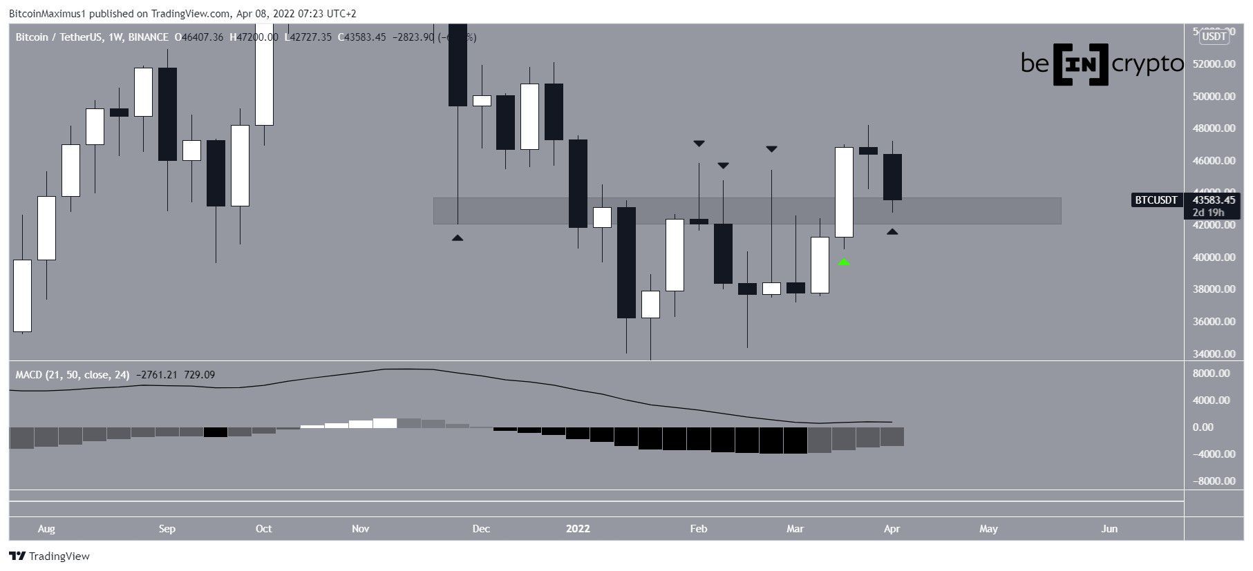 Biểu đồ hàng tuần cho thấy rằng Bitcoin vẫn đang giao dịch trên khu vực 43,000 USD. Mức này đã đóng vai trò là ngưỡng hỗ trợ từ tháng 11 năm 2021 trước khi chuyển sang ngưỡng kháng cự vào tháng 2 năm 2022. Có thể khu vực này sẽ hoạt động như mức hỗ trợ một lần nữa.