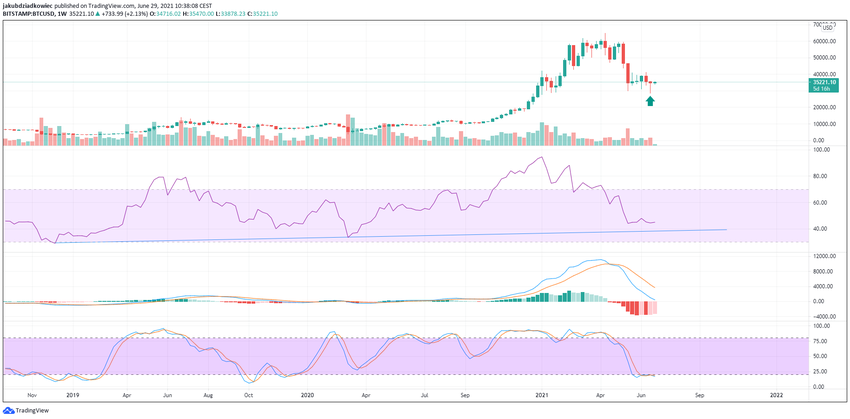 Hơn nữa, mức đóng cửa của Bitcoin được ghi nhận không thấp hơn mức hỗ trợ hàng tuần trong khu vực 32,250 USD (đường màu xanh lam). Vì vậy về mặt kỹ thuật, mô hình của uptrend dài hạn vẫn còn nguyên vẹn.