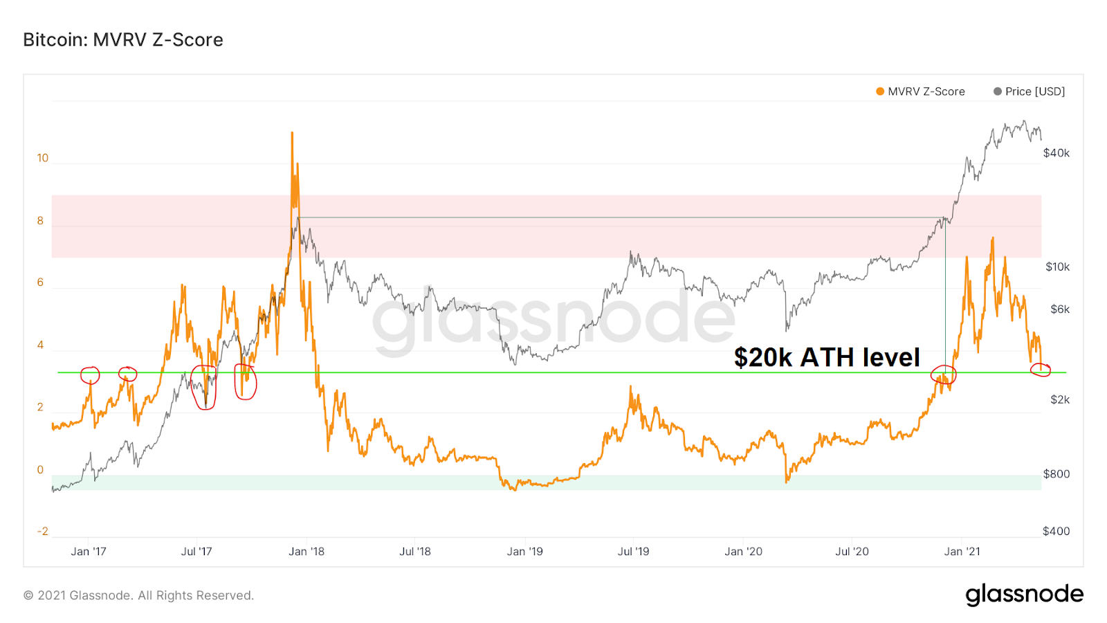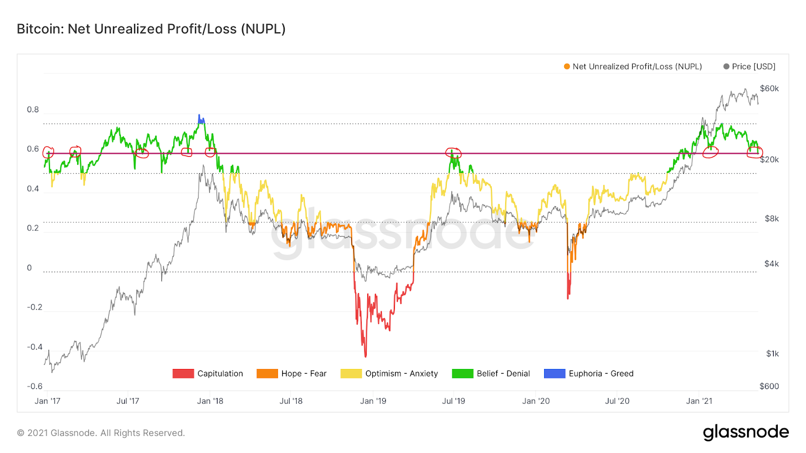Tuy nhiên, quan trọng hơn, nó đóng vai trò như một mức kháng cự ngắn hạn trong hành động giá Bitcoin vào khoảng tháng 12 năm 2020. Đồng tiền mã hóa chính sau đó đã cố gắng phá vỡ mức kháng cự và đạt mức cao lịch sử ở mức $20,000. Và hôm nay, khi BTC ở mức $50,000, chỉ báo này lại có sự sụt giảm ở mức tương tự.