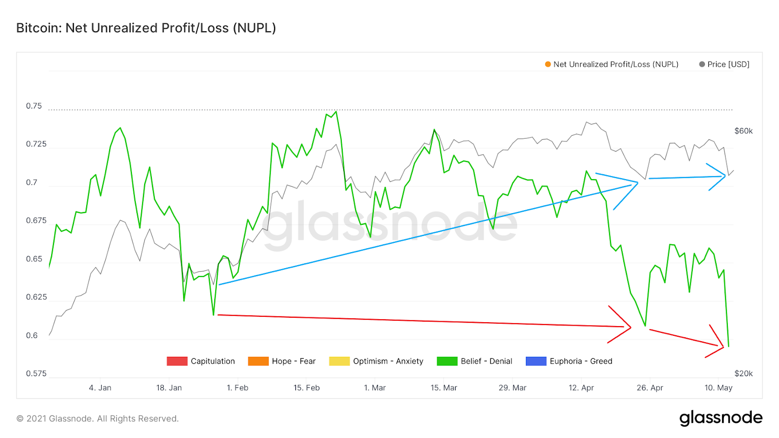 Nhìn vào biểu đồ NUPL trung hạn trong 5 tháng qua, chúng ta có thể thấy rằng nó hiện đang đạt giá trị thấp nhất vào năm 2021. Điều thú vị là chỉ báo này cho thấy sự phân kỳ tăng ẩn khi giá trị của nó giảm (mũi tên màu đỏ) và giá Bitcoin tăng (mũi tên xanh).
