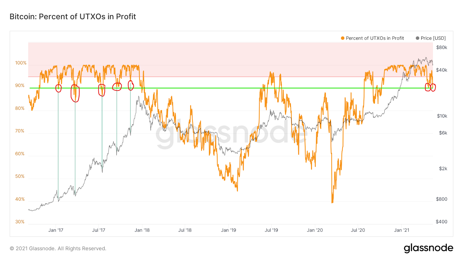 Chỉ số này hiện đã giảm – lần thứ hai trong đợt tăng trưởng này- xuống khu vực 90%. Mức này đã được sử dụng làm hỗ trợ năm lần trong năm 2017. Mỗi lần giá trị này giảm xuống, giá BTC đều đang đạt mức thấp và cho thấy tín hiệu mua mạnh.