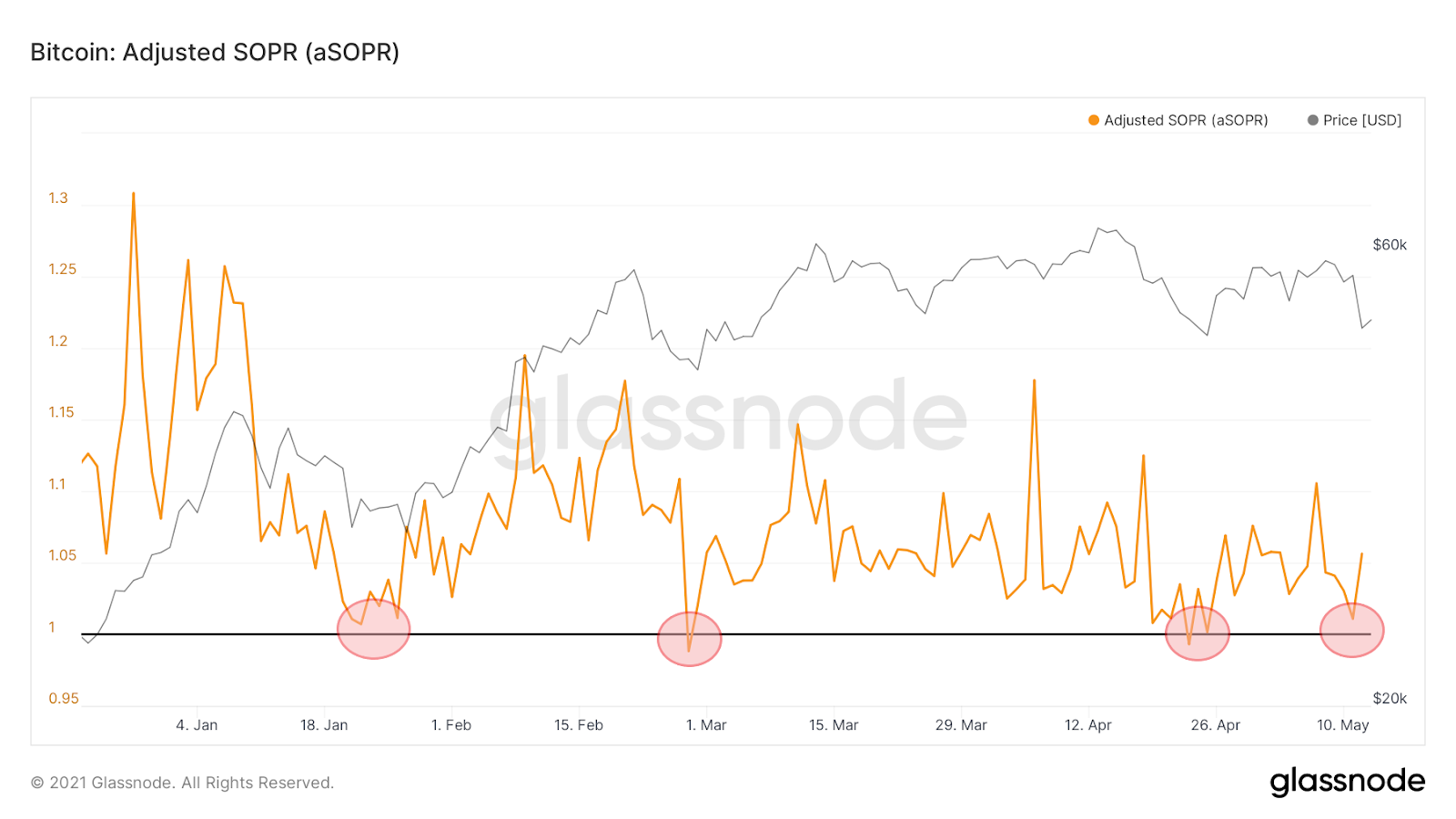 Đối với hành động giá năm 2021, đây đã là lần kiểm tra lại thứ tư của chỉ báo này. Tuy nhiên, miễn là nó nằm trên 1, thị trường vẫn có thể tiếp tục xu hướng tăng giá.
