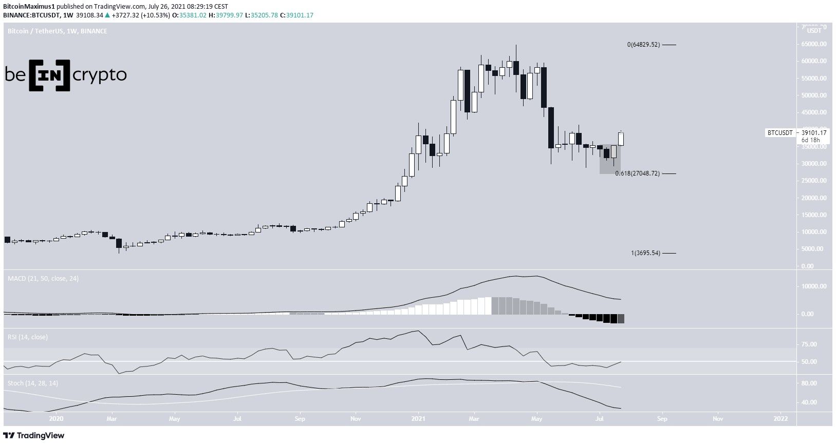 Bắt đầu từ ngày 19 đến ngày 25 tháng 7, BTC đã giảm dần xuống mức thấp nhất là $29,278. Tuy nhiên, một xu hướng tăng mạnh theo sau đó khiến giá BTC đạt được mức cao tại $35,398. Và đóng nến tuần ở $35,381. Điều này đã tạo ra một cây nến nhấn chìm tăng.