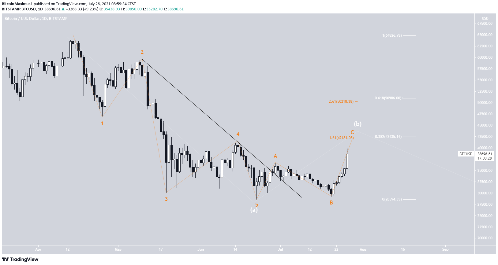 Số lượng sóng có khả năng xảy ra nhất cho thấy BTC đang ở trong sóng B (màu trắng) của cấu trúc điều chỉnh A-B-C dài hạn. Sóng này được đo kể từ mức cao nhất mà BTC từng đạt được vào tháng 4.