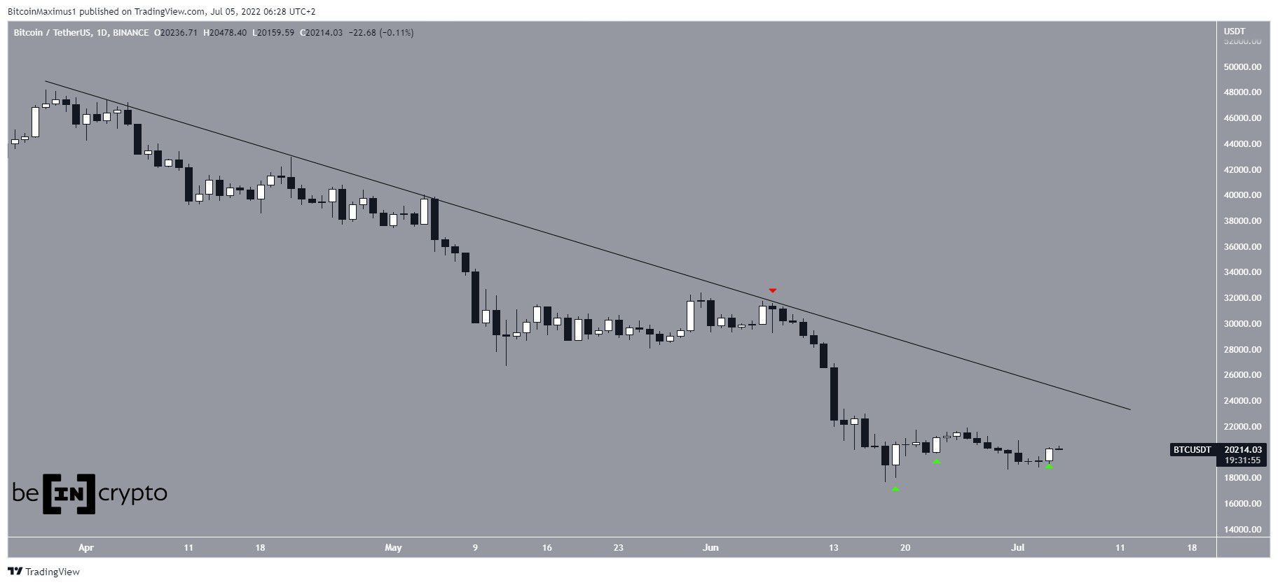Giá đã tăng nhẹ kể từ đó và hiện đang giao dịch chỉ trên 20,000 USD. Một sự phát triển tăng giá là việc tạo ra ba mô hình nến tăng, lần lượt vào các ngày 19 tháng 6, 23 và 4 tháng 7 (biểu tượng màu xanh lá cây).