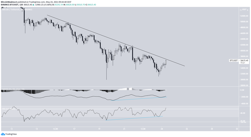 Nó cho thấy sự phân kỳ tăng rất rõ rệt trong cả MACD và RSI. Trong đó, chỉ báo MACD đang rất gần chạm đến được vùng tích cực.