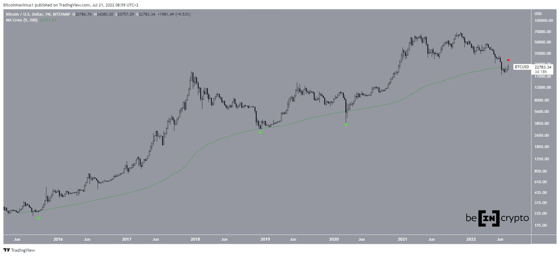 Trong suốt lịch sử giá của Bitcoin, MA200 tuần đã đóng vai trò là đáy giá của BTC nhiều lần (biểu tượng màu xanh lá cây). Trước khi thị trường gấu hiện tại diễn ra, giá đã không còn đóng nến dưới MA này trong một khoảng thời gian dài. Tuy nhiên, trong vài tuần gần đây, BTC đã đạt đến 5 lần đóng nến hàng tuần dưới đường MA này. Về mặt lịch sử, đây là khoảng thời gian dài nhất mà BTC đã trải qua dưới MA200 tuần.