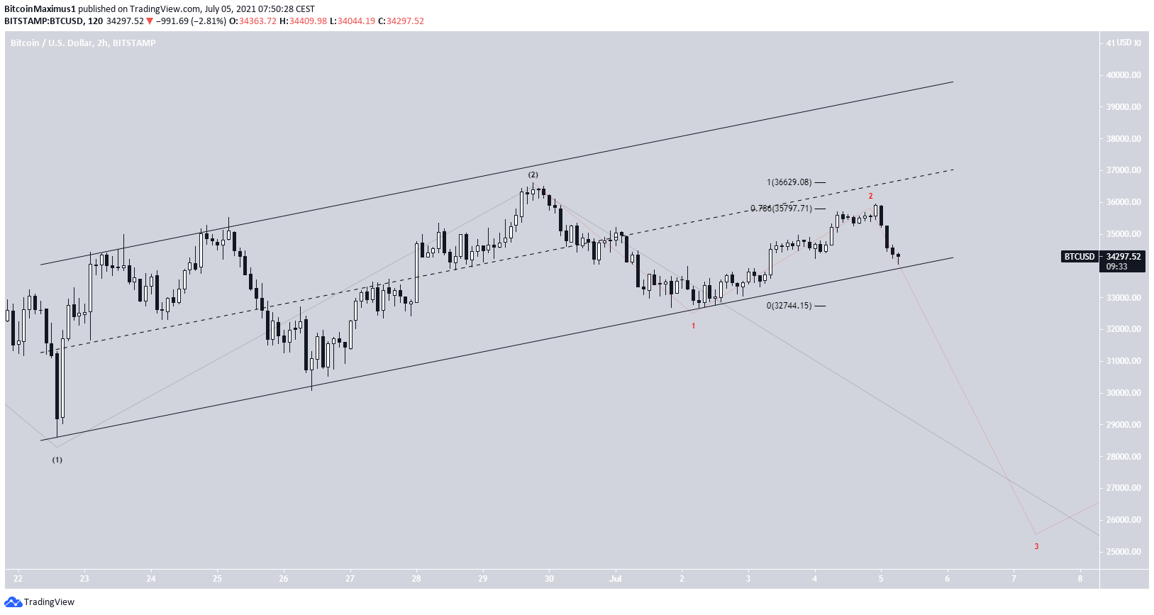 Hiện BTC đã hoàn thành sóng phụ hai (màu đỏ) vào ngày hôm qua, ở gần mức kháng cự Fib 0.786 là $33,800. Tuy nhiên, nó đã không di chuyển được đến giữa kênh và đã bị phá vỡ.