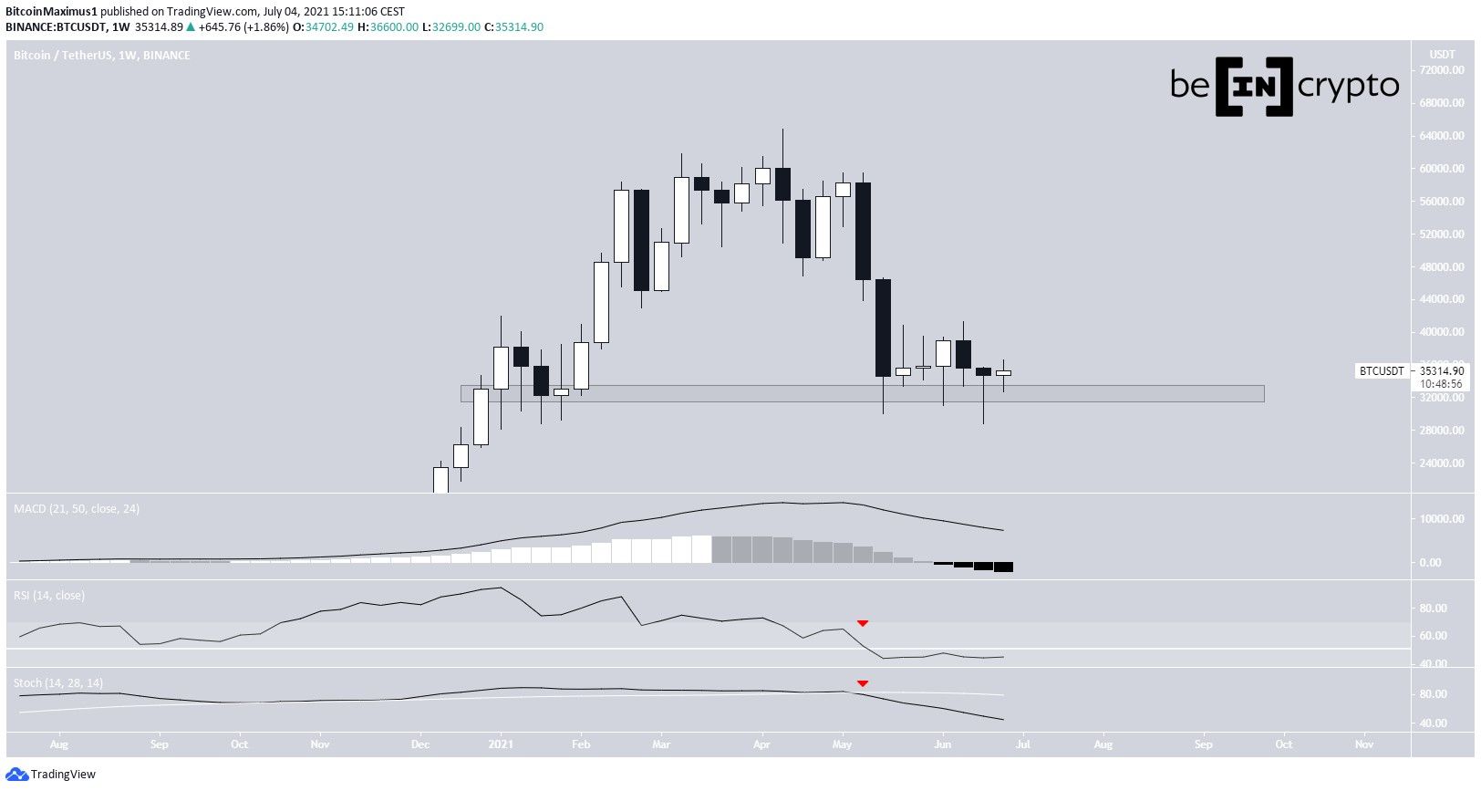 Trong tuần từ ngày 28 tháng 6 đến ngày 5 tháng 7, BTC không di chuyển đáng kể theo bất kỳ hướng nào. Ngược lại, nó dao động trong khoảng từ $32,699 đến $36,660. Tại thời điểm viết bài, giá vẫn đang giao dịch trên mức hỗ trợ ngang dài hạn là $32,600. Và đã tạo ra một râu nến dài thấp hơn bên dưới.