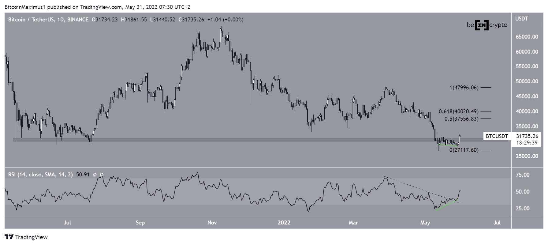 BTC đã tăng lên kể từ khi sụt xuống mức thấp nhất là 26,700 USD vào ngày 12 tháng 5. Cho đến nay, giá của đồng coin đã tăng trở lại mức cao 32,222 USD vào ngày 30 tháng 5.