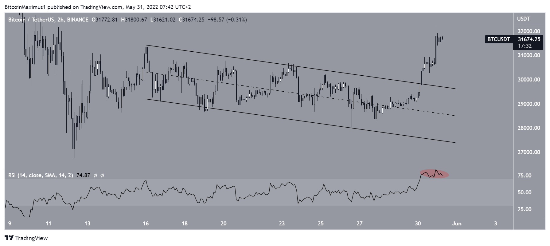 Sau khi thoát ra khỏi mô hình tích lũy ngắn hạn, Bitcoin (BTC) đã tăng lên và đạt mức 32,222 USD. Đây là mức giá cao nhất kể từ ngày 10 tháng 5.