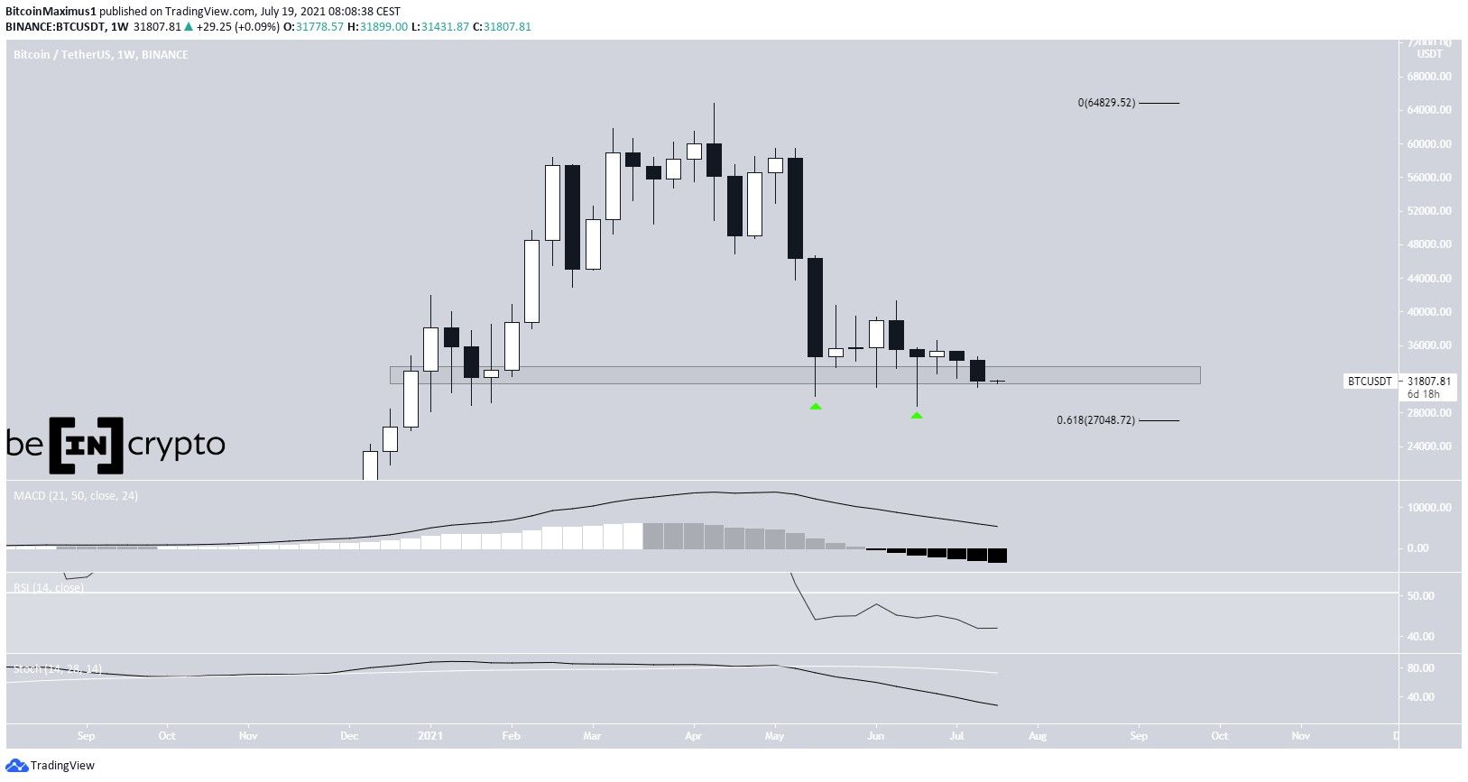 BTC đã tăng kể từ khi bật lên trên đường hỗ trợ (biểu tượng màu xanh lá cây) vào ngày 16 tháng 7. Phong trào đi lên được bắt đầu bởi sự phân kỳ tăng trong chỉ báo RSI. Trong khi chỉ báo MACD đang đi lên, giá vẫn ở phần dưới của kênh.