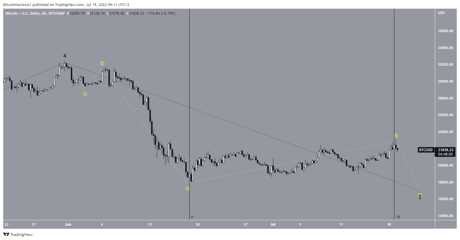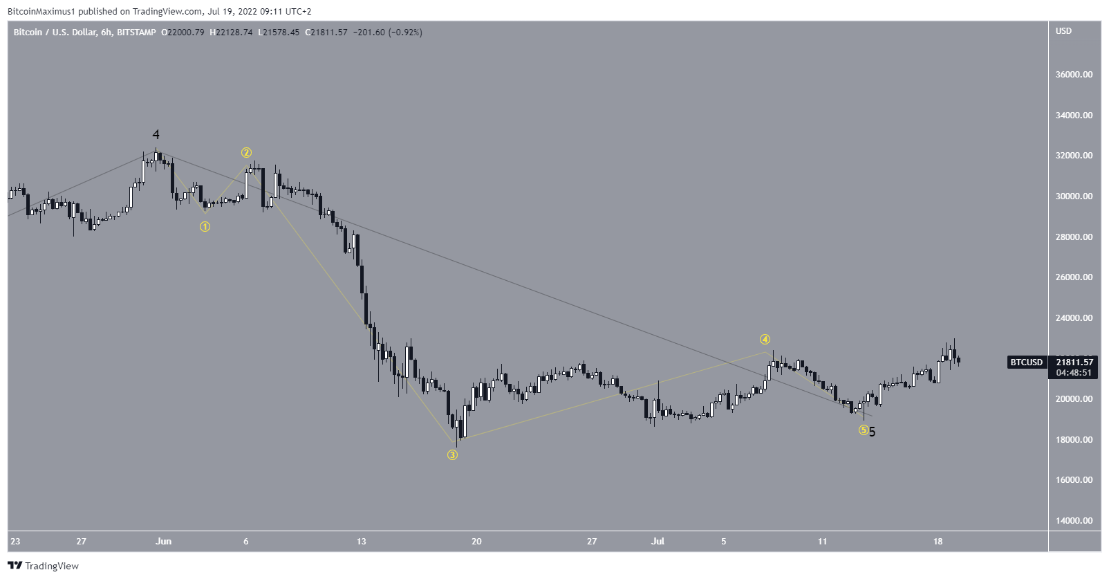 Số lượng sóng có nhiều khả năng nhất cho thấy rằng Bitcoin đã hoàn thành đợt giảm bao gồm năm sóng (màu vàng), tính từ đầu tháng 4. Trong số lượng tiềm năng này, sóng năm đã bị cắt bớt, kết thúc trên đáy của sóng ba.