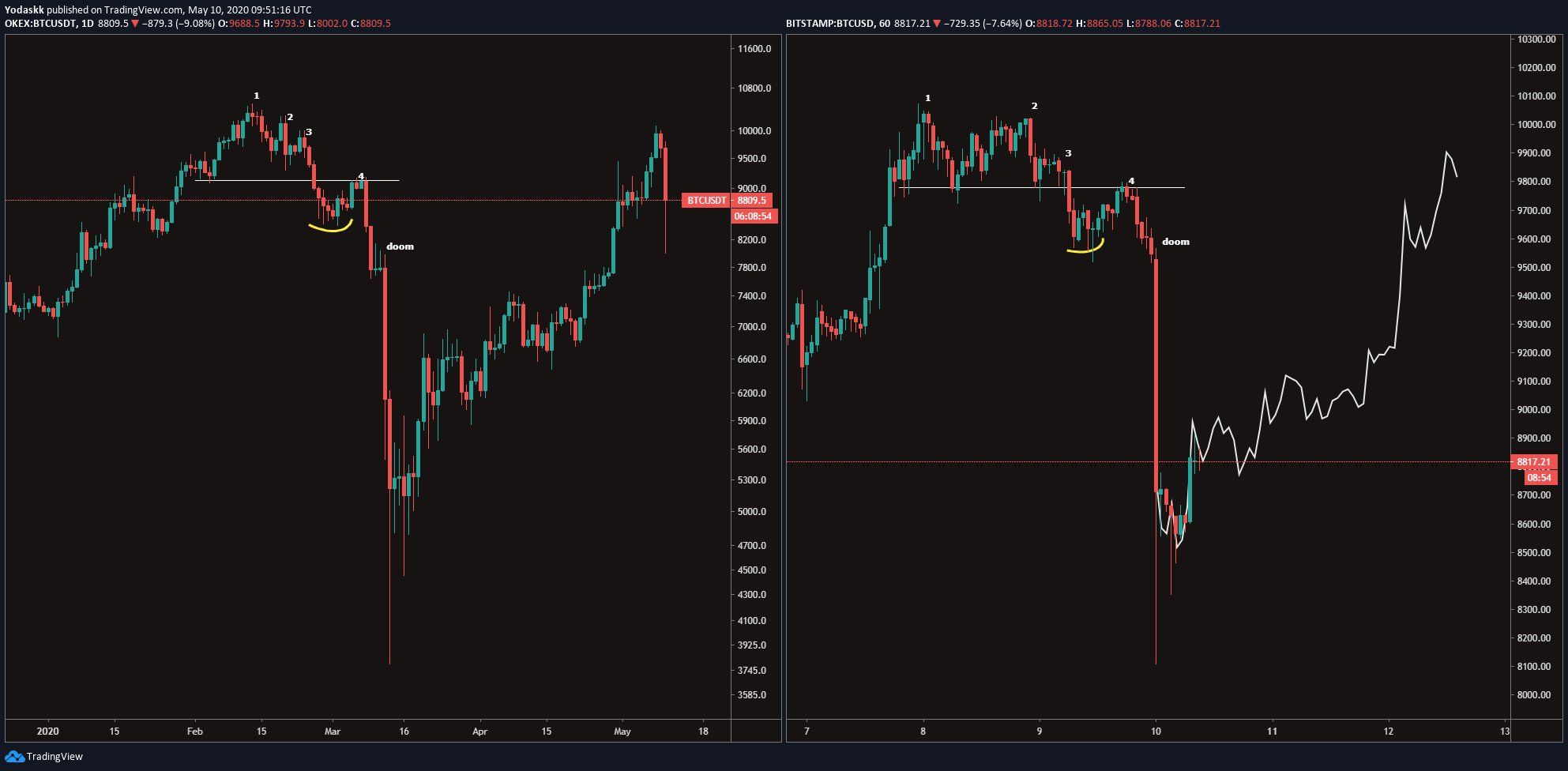 Cả hai giai đoạn đều có một đỉnh phân thành 4 giai đoạn, một đợt sụt giảm sâu, và một đợt hồi phục từ đáy thấp. Nếu nhìn vào biểu đồ này thì hiện nay, BTC vẫn đang trong giai đoạn phục hồi. Phân dạng này cho thấy, Bitcoin sẽ sớm chạm đến 10.000 USD.