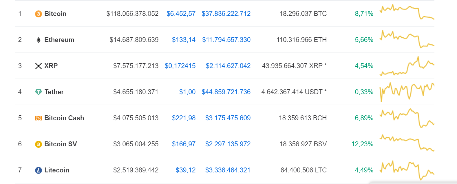 SponsoredCác đồng coin chủ chốt trong top vốn hóa thị trường đều tăng giá. Ethereum (ETH) tăng 5,66%, đang được giao dịch tại 133 USD. XRP của Ripple tăng 4,54%, Bitcoin Cash (BCH) tăng 6,89%, trong khi Bitcoin SV (BSV) tăng cao nhất với 12,23%.