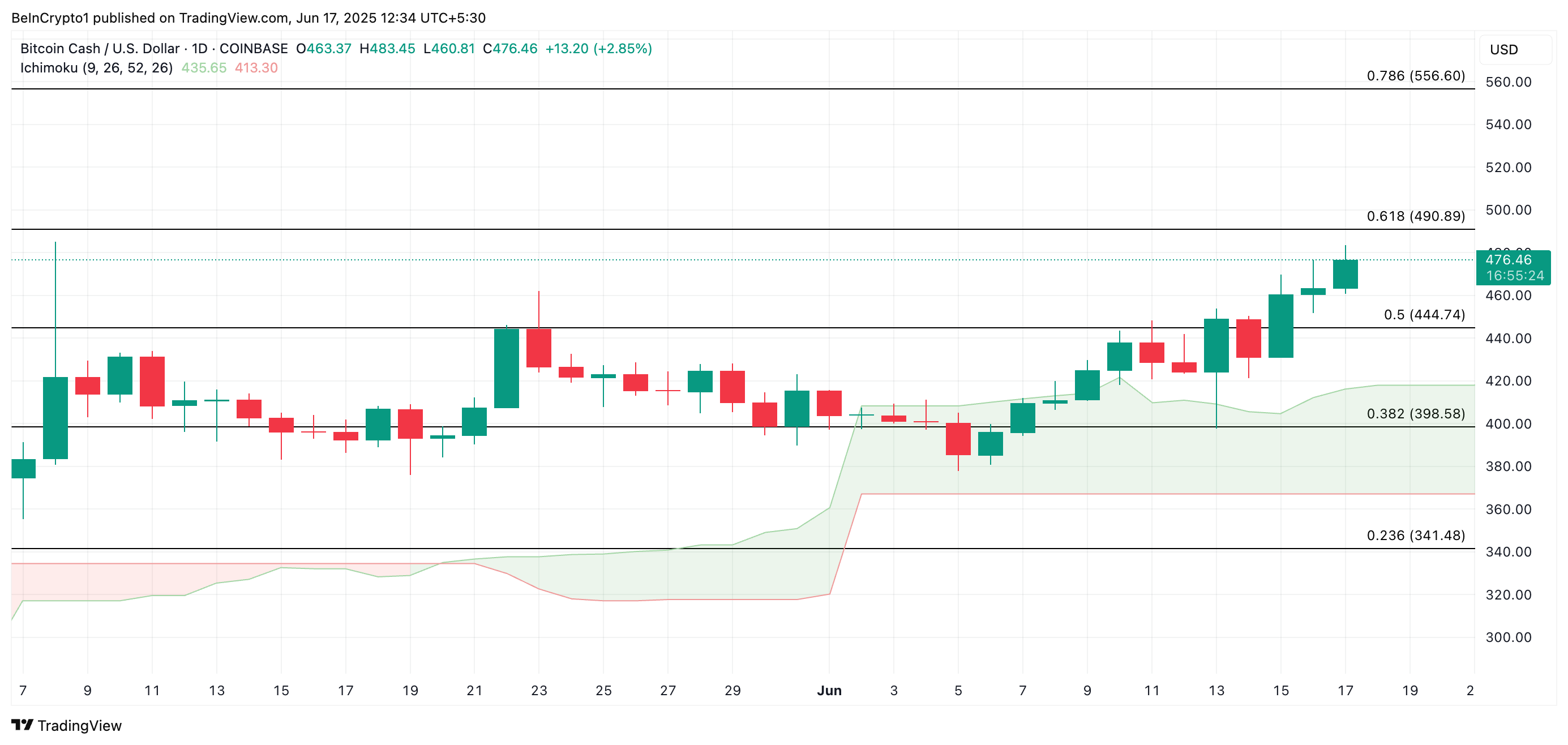 Hiện tại, altcoin này giao dịch trên các đường Leading Spans A và B của Ichimoku Cloud, phản ánh tâm lý lạc quan của các nhà đầu tư BCH. Các đường này tạo thành các mức hỗ trợ động dưới giá của BCH ở mức 435.65 USD và 413.30 USD, tương ứng.