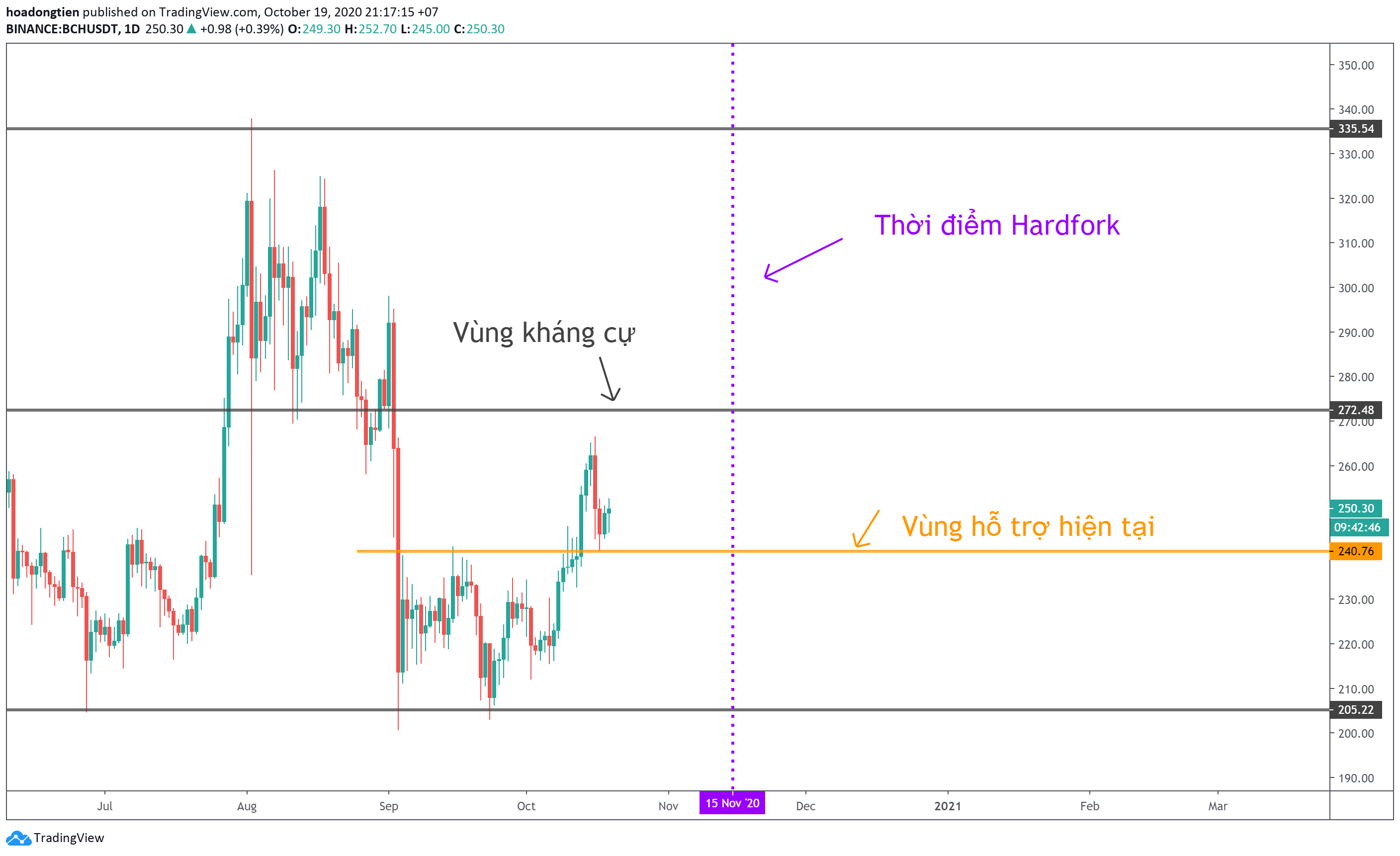 - Vấn đề quan trọng thứ hai là liên tục để ý mốc thời gian ngày 15 tháng 11. Lần trước (tức sự kiện HardFork của BCH tháng 11 năm 2019), giá tăng trước sự kiện Hardfork và lập đỉnh trước Hardfork 01 tuần. Nghĩa là 1 tuần trước sự kiện, BCH đã liên tục chịu lực bán chứ không phải chờ đến ngày sự kiện xảy ra.