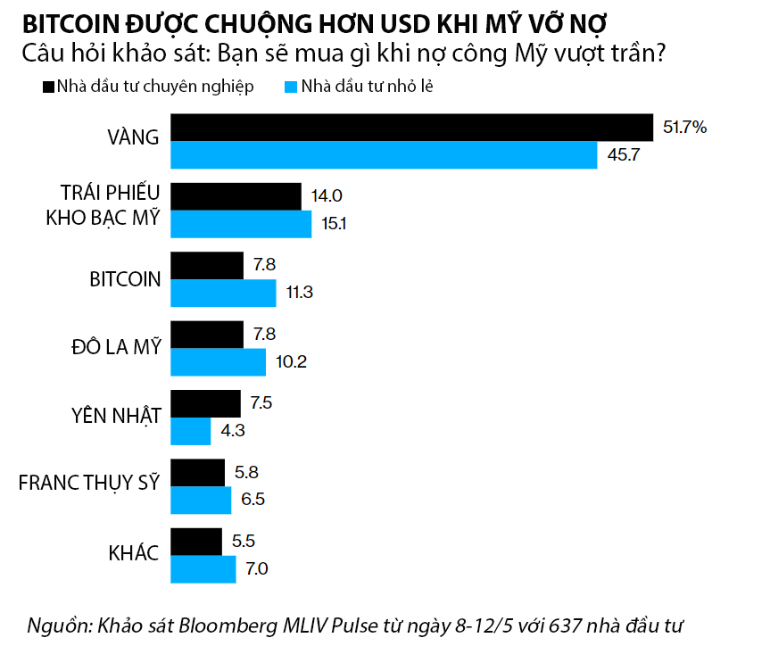 - Bitcoin dù được xếp trên đô la Mỹ khi được hỏi “Bạn sẽ mua gì khi nợ công Mỹ vượt trần?” nhưng không có nhiều sự chênh lệch (có thể xem là ngang bằng). Khảo sát này một lần nữa nhấn mạnh sức hấp dẫn của Vàng khi là tài sản được nghĩ đến hàng đầu đối với cả nhà đầu tư chuyên nghiệp và nhỏ lẻ.