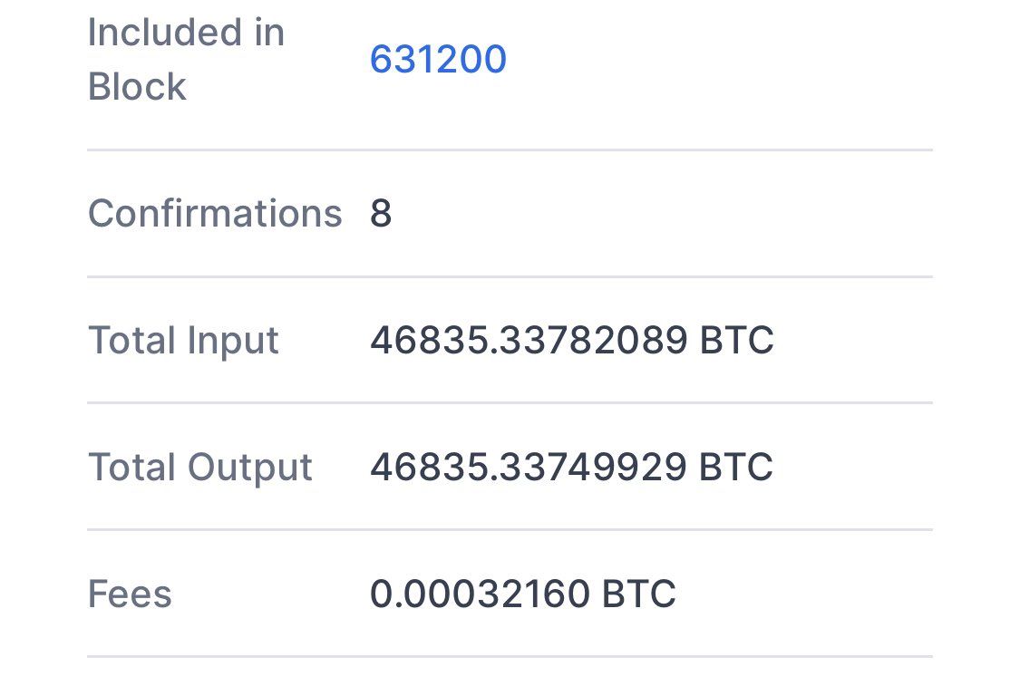 Giao dịch lớn này vừa được Youtuber Ivan on Tech chia sẻ sáng nay (22/5) trên Twitter của mình. Thông tin và hình ảnh cho thấy, một giao dịch với hơn 46,835 BTC đã được hoàn thành, mức phí chỉ tương đương 0.000322 BTC.