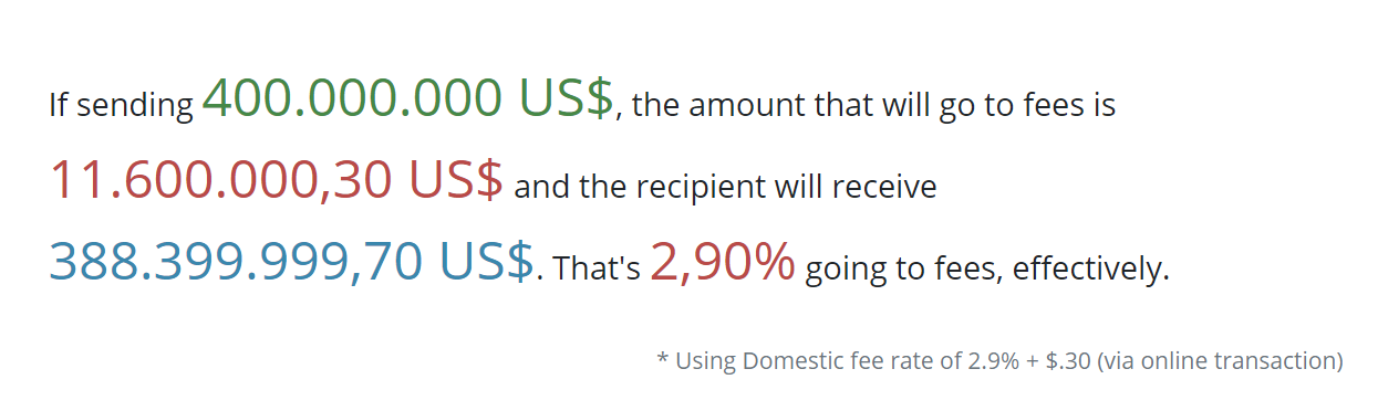 Nếu thực hiện giao dịch qua các hình thức truyền thống khác thì đây là một mức phí không tưởng. Đơn cử nếu như thực hiện giao dịch này trong phạm vi nước Mỹ qua Paypal thì phí giao dịch ước tính sẽ là 11.600.000,30 USD.