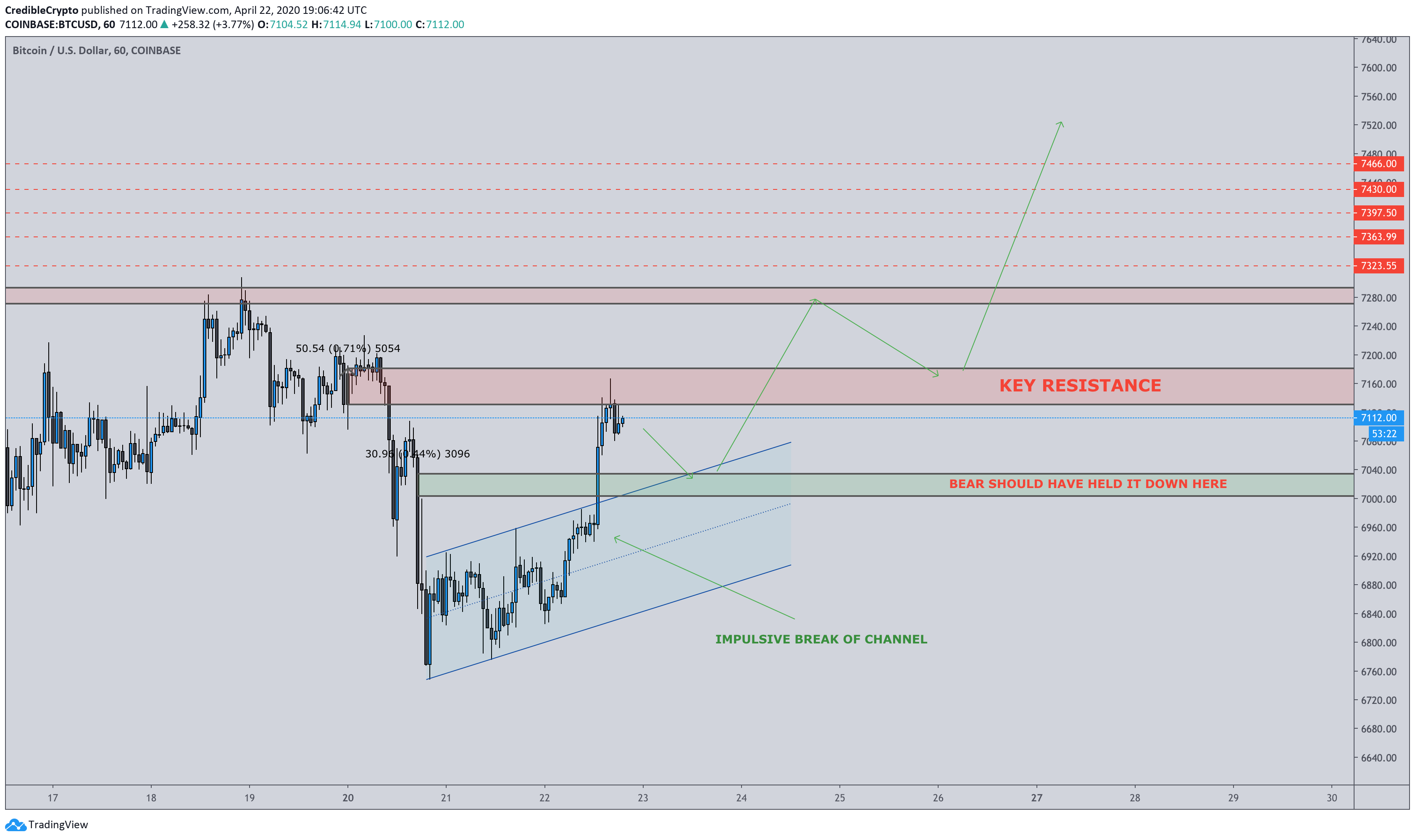 Việc Bitcoin trở lại khu vực trên 7.000 USD do đó càng trở nên ý nghĩa. Là một bước đệm để BTC hội tụ đủ động lực để đột phá đi lên cao hơn. Nhà giao dịch @CredibleCrypto đã đề cập đến sự đột phá này trong một tweet gần đây.