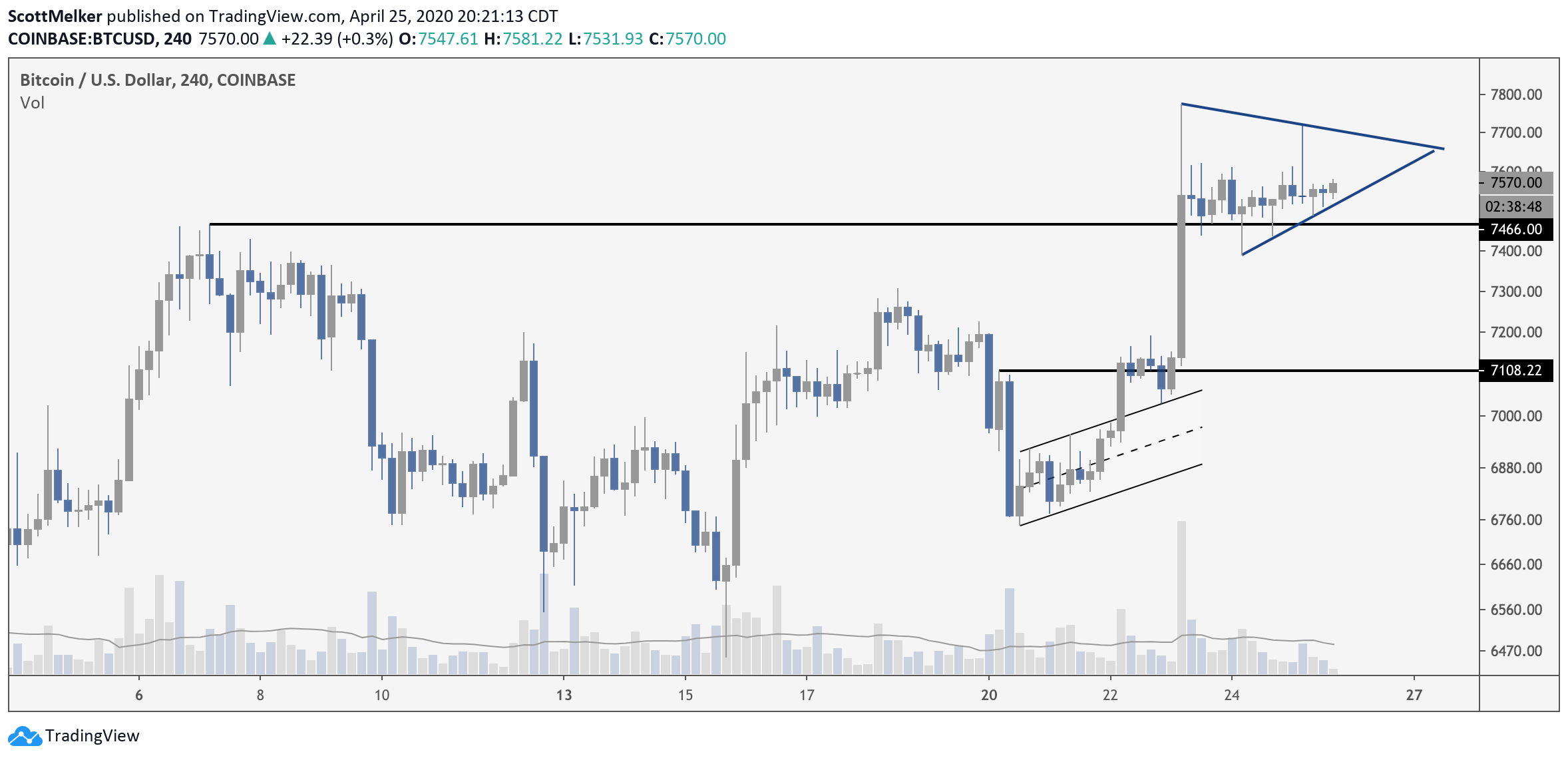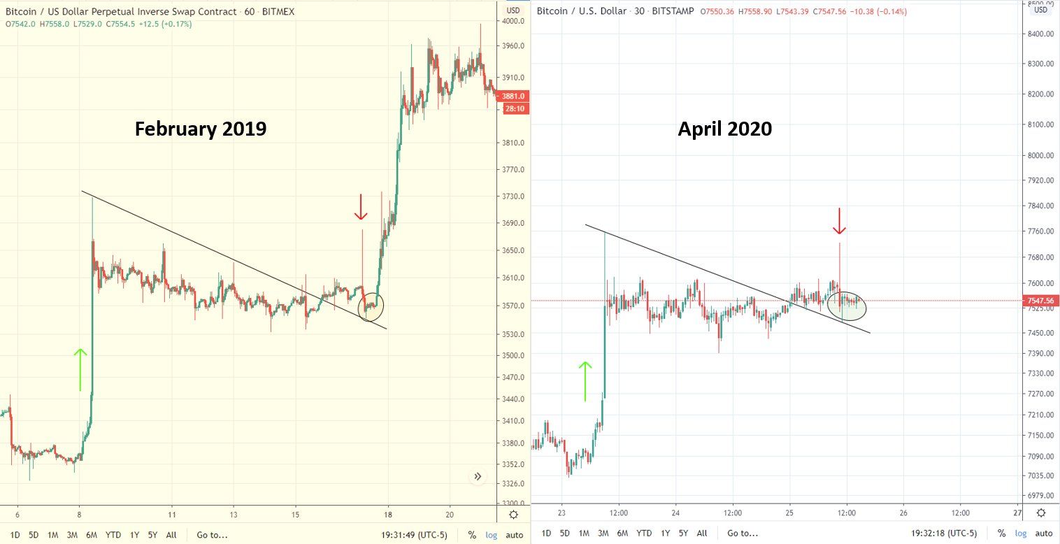 “Tháng 2/2019 đánh dấu bull flag (cờ tăng giá), đảo ngược 14 tháng của thị trường giá giảm. Tháng 4/2020 có vẻ cũng đang thiết lập một sự bùng bổ tương tự.” – @CryptoKaleo