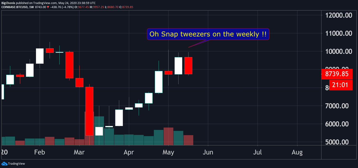 Nhà giao dịch được nhiều người biết đến @BigChonis vừa chia sẻ một biểu đồ trên twitter của mình. Trên biểu đồ hàng tuần của Bitcoin cho thấy một đỉnh nhíp điển hình, với 2 nến liên tiếp tương tự nhau. Với việc bị từ chối tại ngưỡng kháng cự 10.000 USD thì có khả năng đồng coin này sẽ còn giảm sâu hơn.