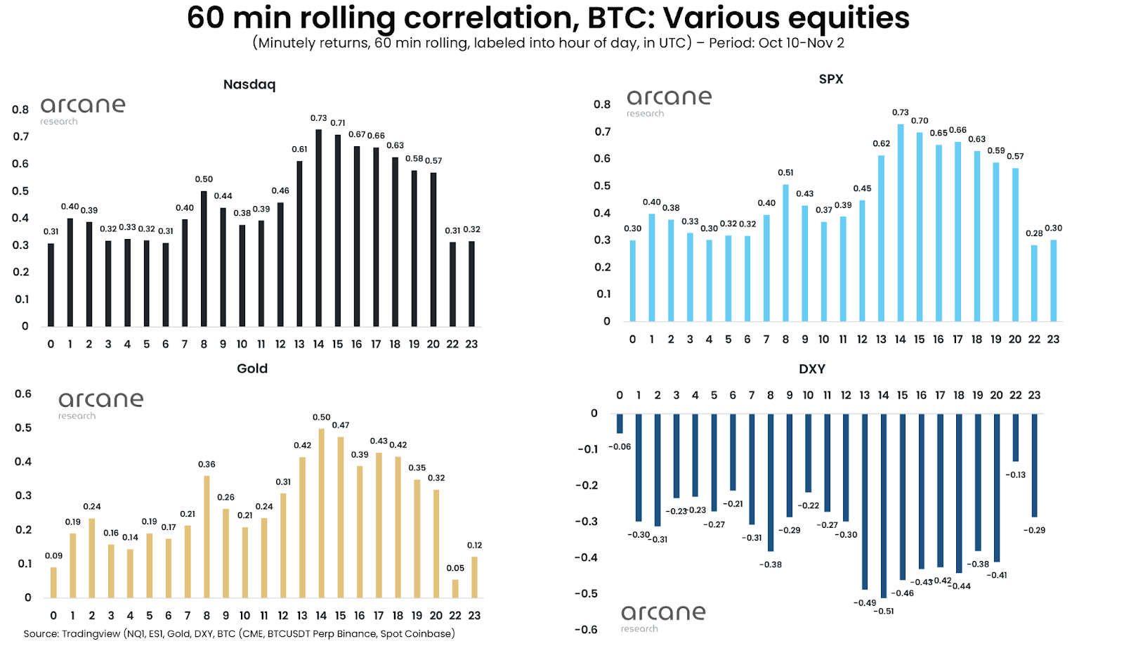 Điều này gần đây đã được chỉ ra bởi người dùng @VetleLunde, thông qua một đoạn tweet từ tháng 10/2022 về mối tương quan của Bitcoin với NASDAQ, SPX, vàng và DXY. Dựa trên những dữ liệu này, ông kết luận rằng các thị trường có mối tương quan đến nhau nhiều hơn trong khung giờ giao dịch của Hoa Kỳ và khi công bố dữ liệu lạm phát (ngày 13/10). Do đó, chúng ta thấy rằng các nhà đầu tư Hoa Kỳ hiện đang xem Bitcoin như một tài sản có rủi ro khác hơn là đánh giá Bitcoin chống lạm phát.