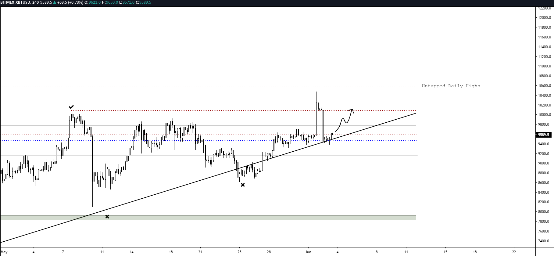 “Đường xu hướng chéo và EQ vẫn đang giữ vững như là đường hỗ trợ. Đóng cửa nến 4 giờ trên một S&R chính tại 9.580 USD. Khu vực đáng chú ý đầu tiên là tại 9.790 USD. Thời gian sẽ đưa nó trở lại 5 con số?” – @CryptoUB