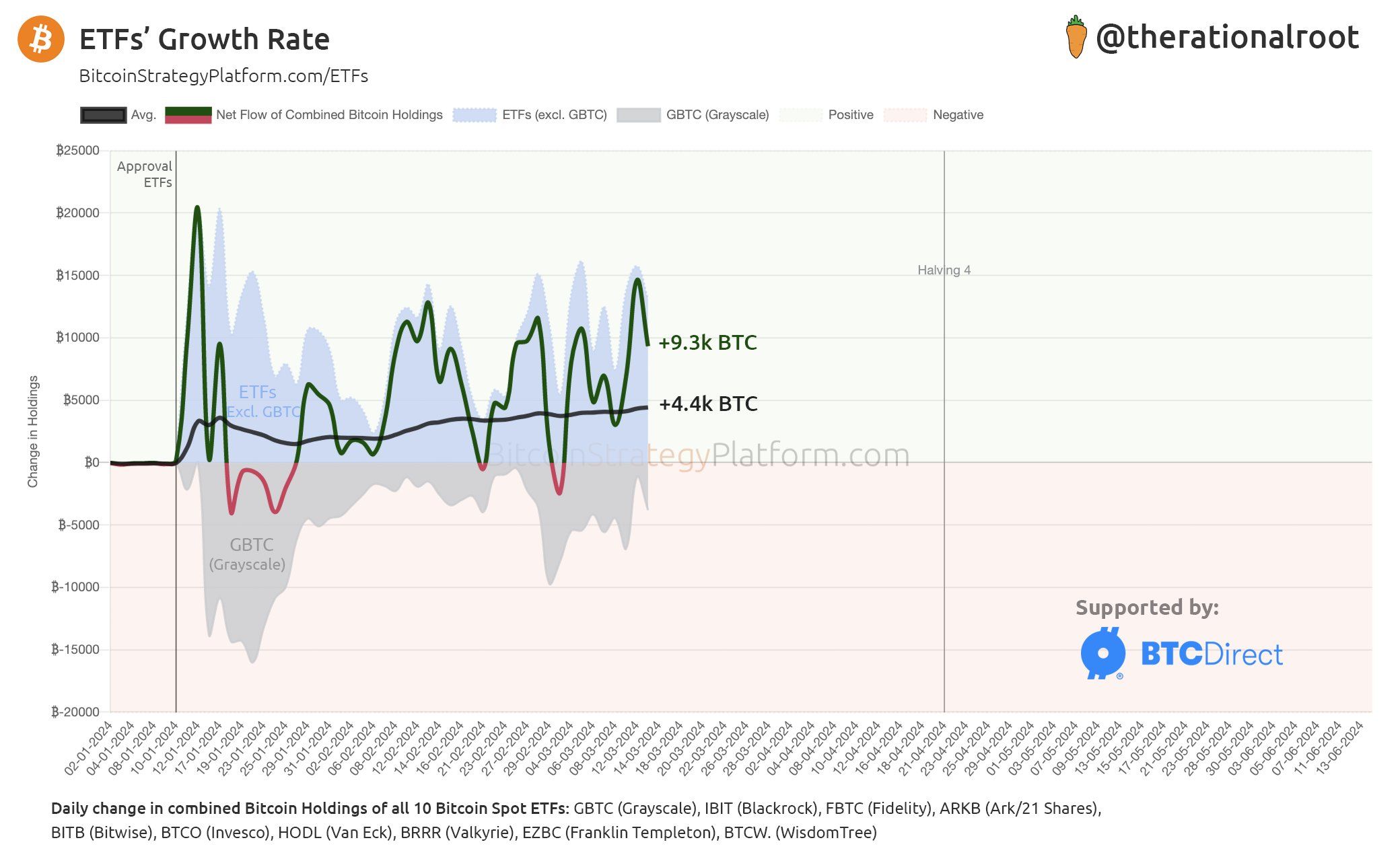 Nếu xét trên tất cả các Bitcoin ETF, bao gồm cả những đợt bán ra mạnh mẽ của Grayscale, thì cho đến nay Net Inflow trung bình của các quỹ là khoảng 4,400 BTC mỗi ngày. Nếu con số này giữ vững và không đổi, thì cứ mỗi tháng các ETF sẽ hút khoảng 0.5% nguồn cung BTC lưu thông. Có thể nói, đây là động lực “điên rồ” nhất mà giá Bitcoin có được trong lịch sử tăng trưởng của mình.