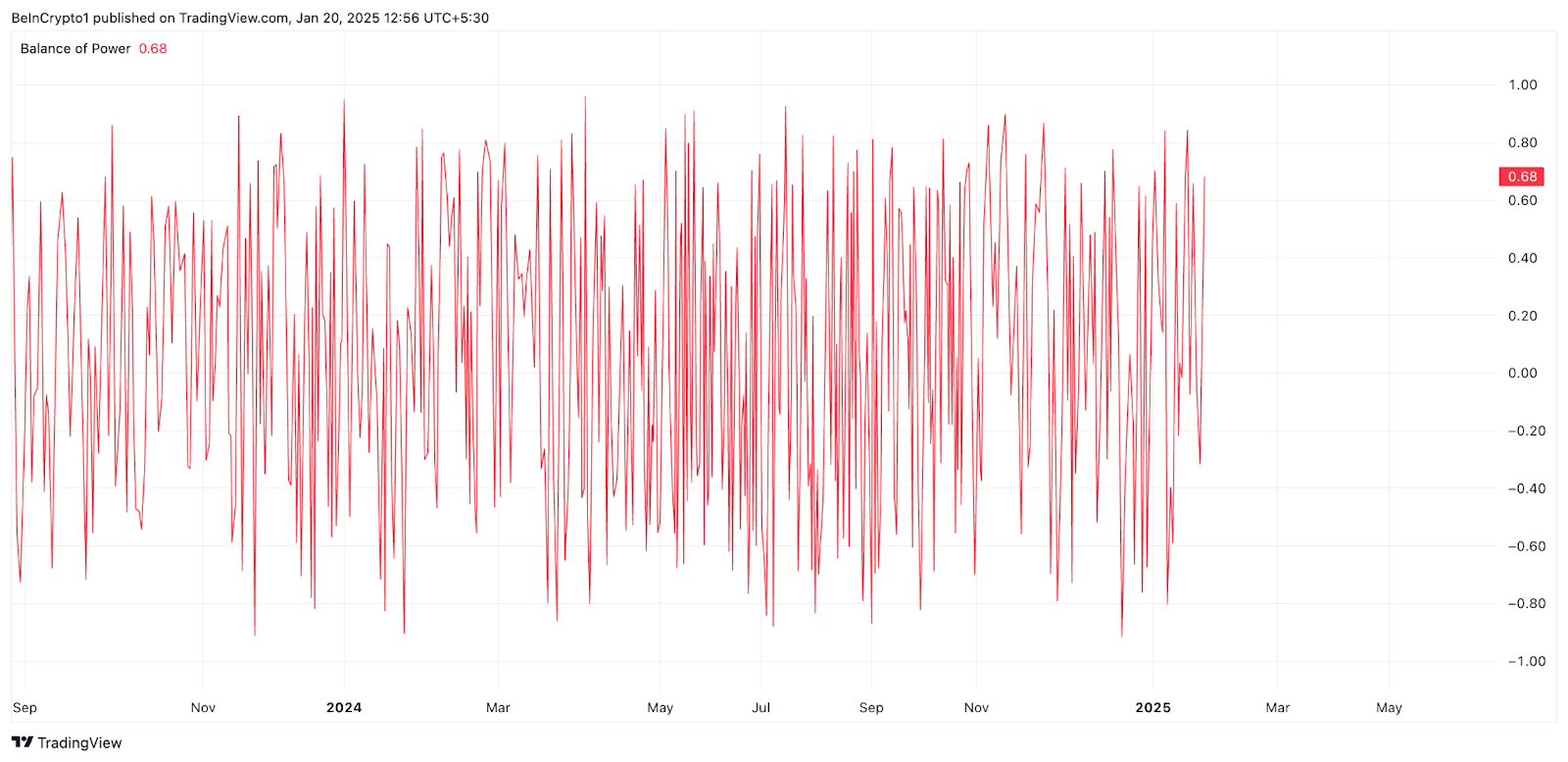 Chỉ báo động lượng này đo lường sự tương tác giữa áp lực mua và bán, cho biết liệu phe mua (bò) hay phe bán (gấu) đang kiểm soát. Đối với BTC, BoP dương nghĩa là người mua đang chiếm ưu thế, đẩy giá lên khi nhu cầu vượt quá cung.