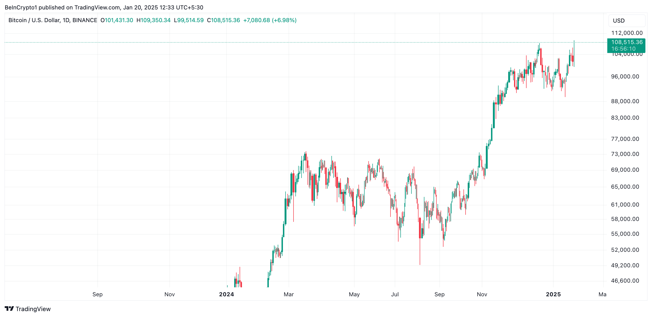 Đồng coin hàng đầu, Bitcoin (BTC), đã chạm mức cao nhất mọi thời đại mới là 109,350 USD trong phiên giao dịch sớm ngày thứ Hai. Sự tăng vọt này diễn ra giữa bối cảnh thị trường chung suy giảm trong 24 giờ qua.