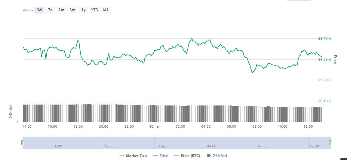 Ghi nhận vào đầu giờ chiều nay (30//1), giá của Bitcoin giảm nhẹ so với hôm qua. Cụ thể, Bitcoin đạt 9.315, 61 USD, giảm 0,31% so với ngày hôm qua. Các đồng coin nằm trong top 5 có vốn hóa lớn nhất thị trường cũng có tình cảnh tương tự.
