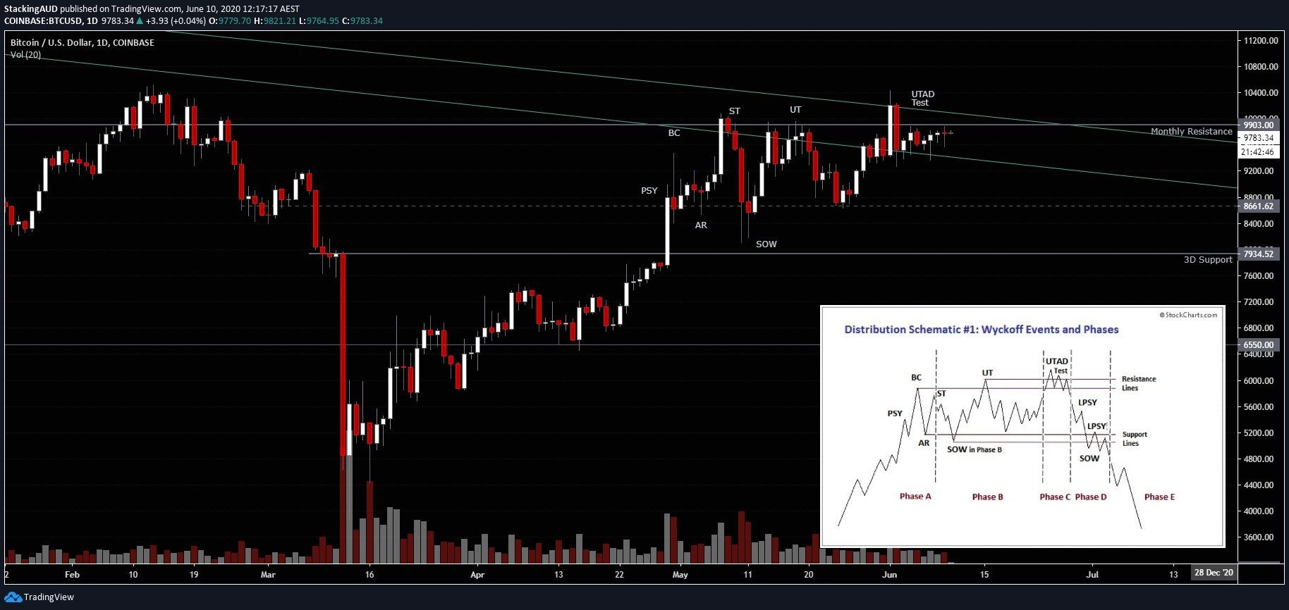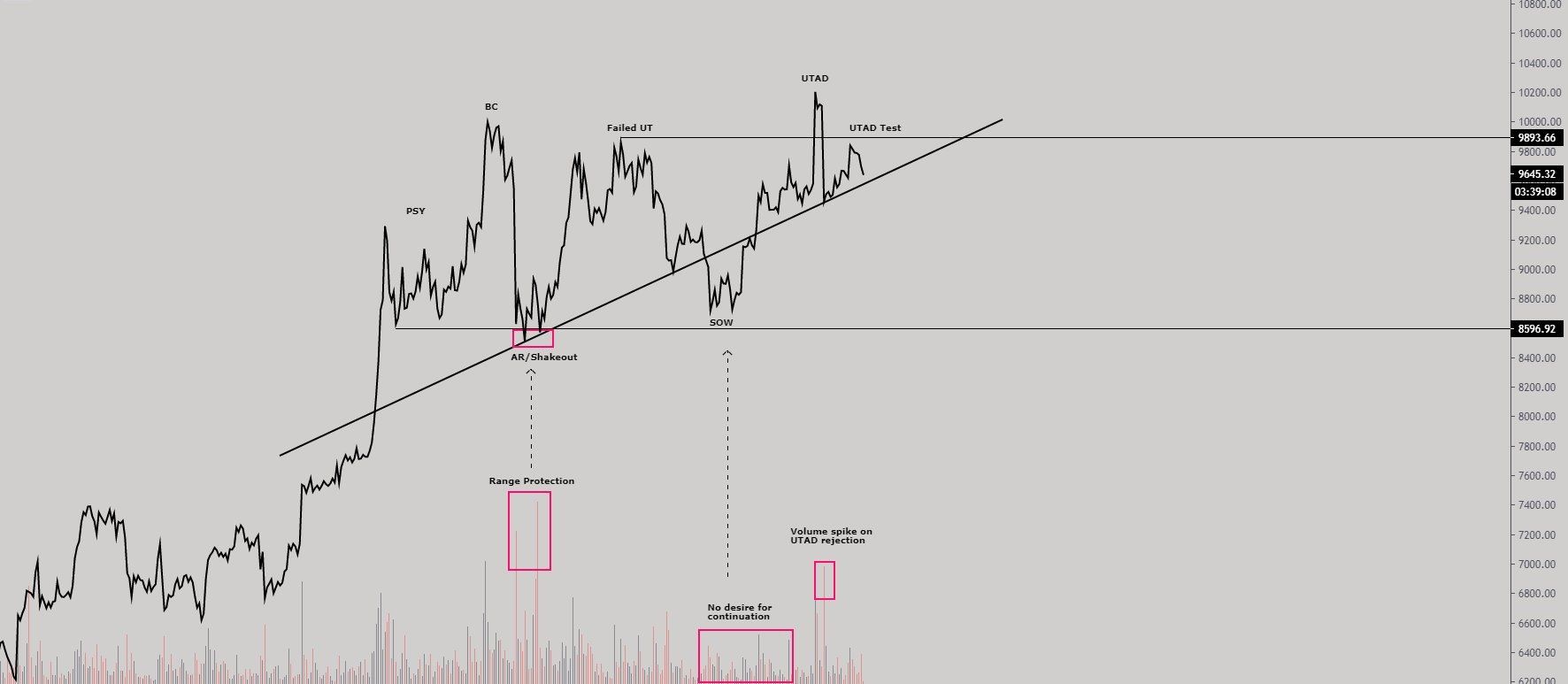 “Có rất ít phạm vi tái tích lũy để có thể hỗ trợ cho một chuyển động đi lên qua khu vực đã bị từ chối một cách mạnh mẽ. Thông thường thì trong một cấu trúc tái tích lũy, chuyển động này sẽ được duy trì. Đây là một trong 4 dấu hiệu của phân phối.” – @ColdBloodShill
