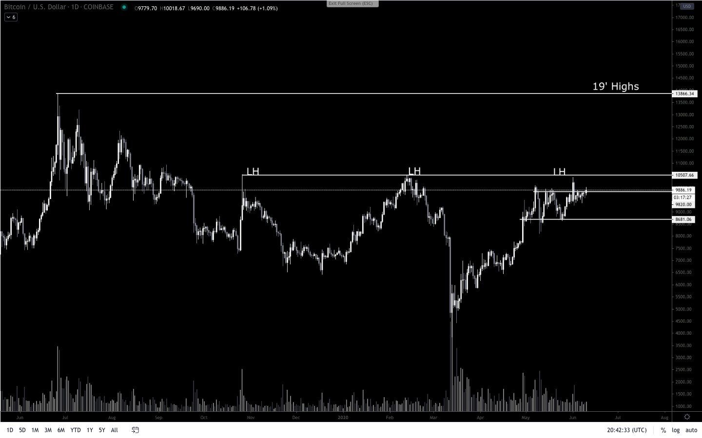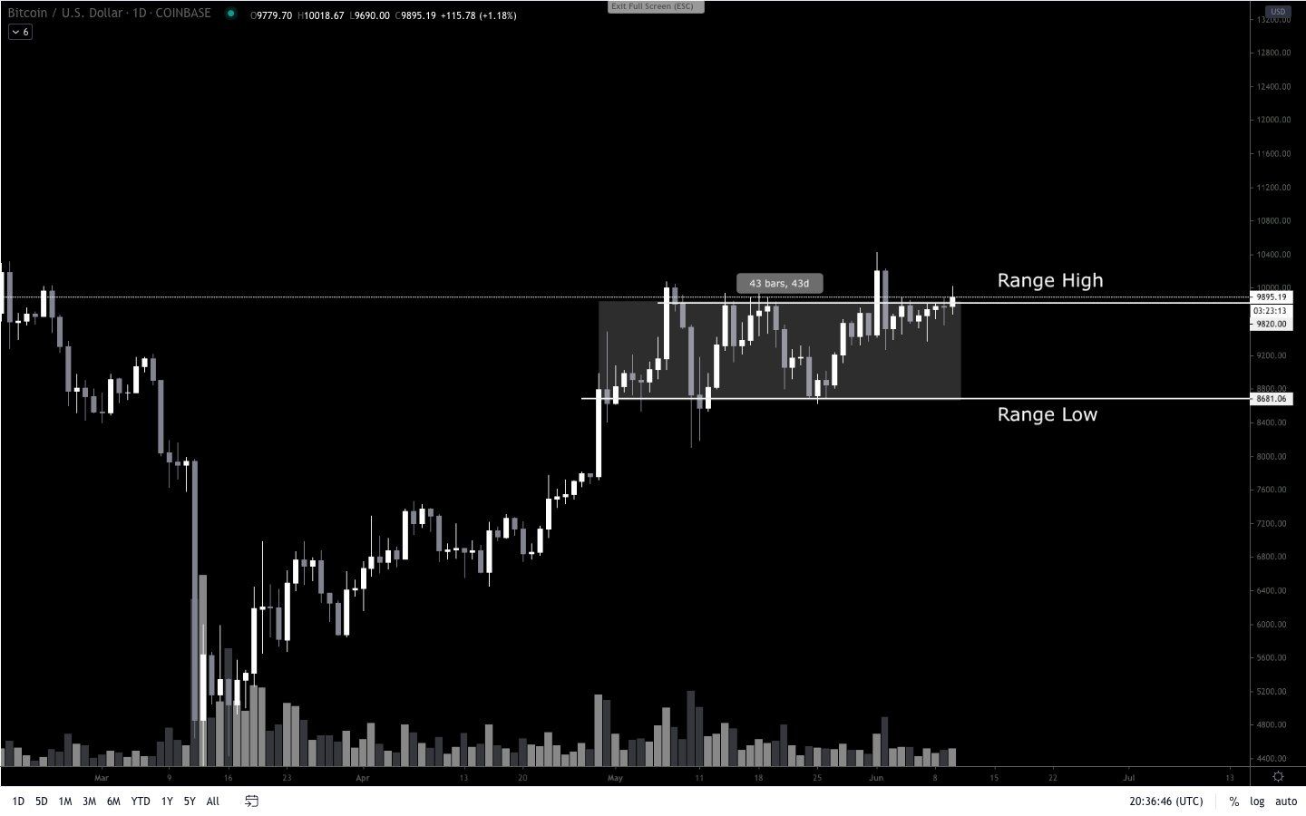 “BTC đang cố vượt lên trên khu vực đã hình thành trong 43 ngày tại 9.820 USD. Đó là vượt lên trên cấp độ 1 ngày và 1 tuần của MA. Xu hướng đi lên kể từ đáy tháng 3.” – @Pentosh1