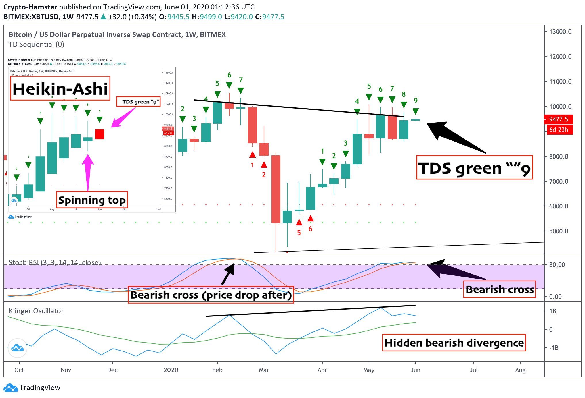 “Trên khung thời gian hàng tuần hiện có: Chỉ báo TD Sequential 9 xanh, các phân kỳ giá giảm tiềm ẩn, điểm giao cắt giá giảm Stochastic RSI, và một spinning top Heikin-Ashi của tuần trước. Giá Bitcoin có khả năng giảm trong vòng 14 ngày tới.” – @CryptoHamsterIO