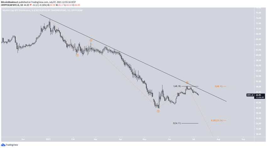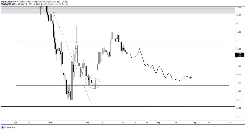 Nhà giao dịch tiền điện tử @Damskotrades đã phác thảo biểu đồ BTCD. Ông cho biết khả năng cao nó sẽ giảm về khu vực 42%. Điều này cũng phù hợp với thông tin từ biểu đồ khung giờ hàng ngày đưa ra.