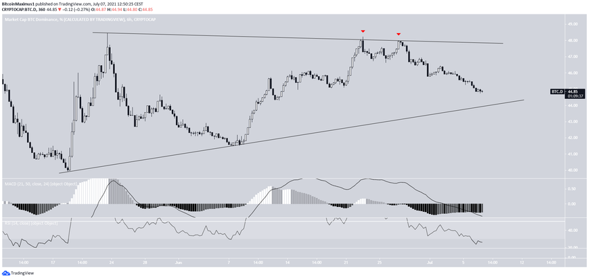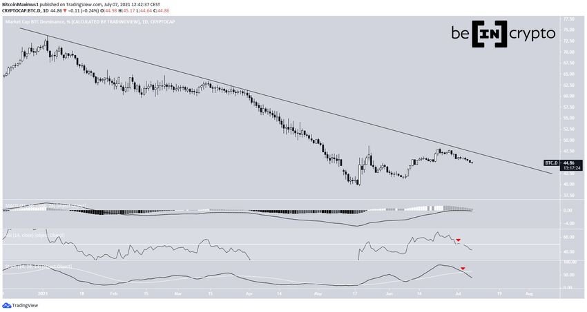 Kể từ ngày 4 tháng 1, Bitcoin Dominance Rate (BTCD) đã dịch chuyển theo đường kháng cự giảm dần. Và trong lần đây nhất, BTCD đã bị đường này từ chối vào ngày 30 tháng 6.